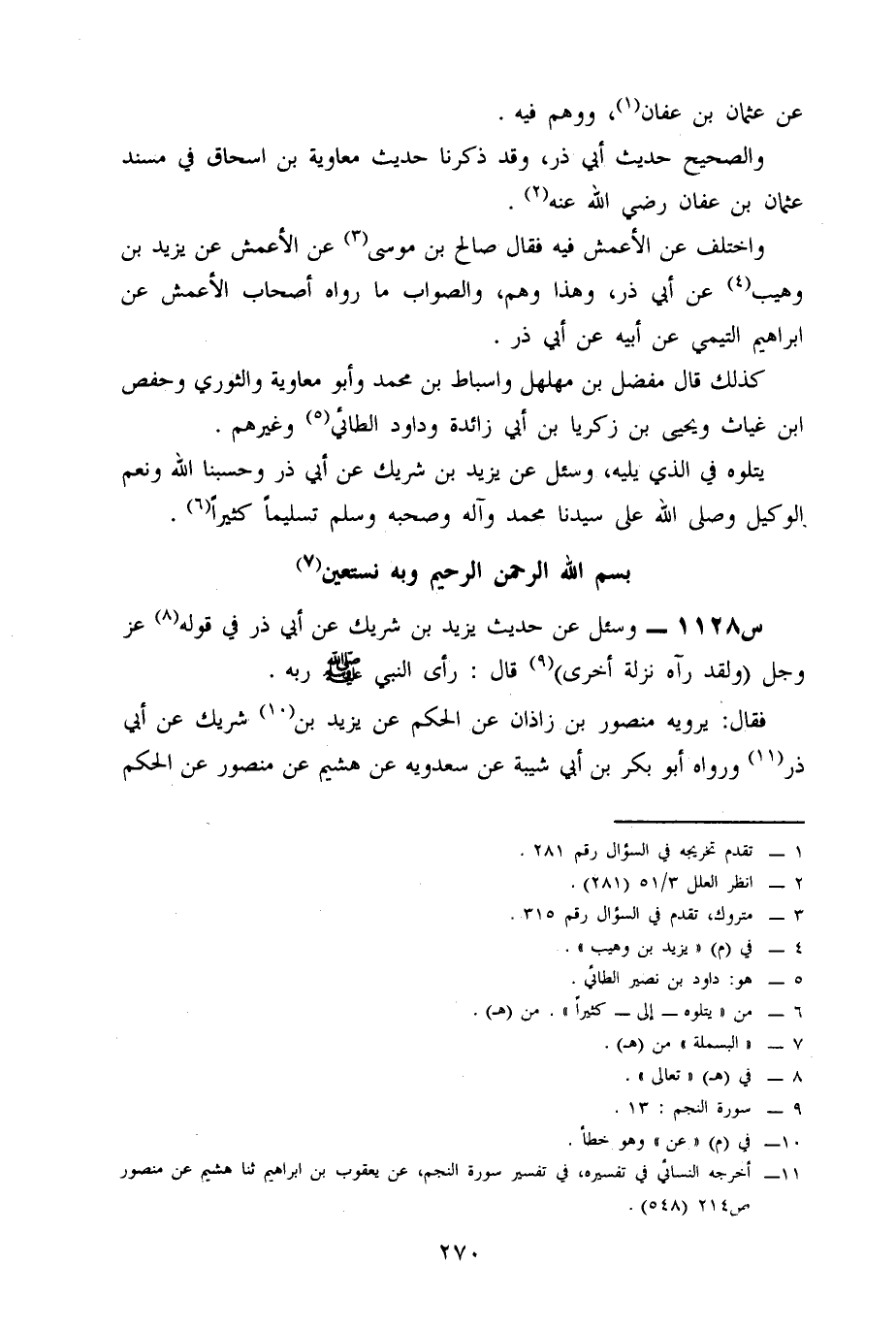 1128- وسئل عن حديث يزيد بن شريك، عن أَبِي ذَرٍّ فِي قَوْلِهِ عَزَّ وَجَلّ {وَلَقَدْ رآه نزلة أخرى} قَالَ رَأَى النَّبِيُّ صَلَّى اللَّهُ عَلَيْهِ وَسَلَّمَ رَبَّهُ.