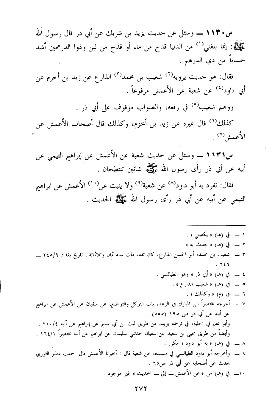 1131- وَسُئِلَ عَنْ حَدِيثِ شُعْبَةَ، عَنِ الْأَعْمَشِ، عَنْ إِبْرَاهِيمَ التَّيْمِيِّ، عَنْ أَبِيهِ، عَنْ أَبِي ذَرٍّ رَأَى رَسُولُ اللَّهِ صَلَّى اللَّهُ عَلَيْهِ وَسَلَّمَ شَاتَيْنِ تَنْتِطَحَانِ.