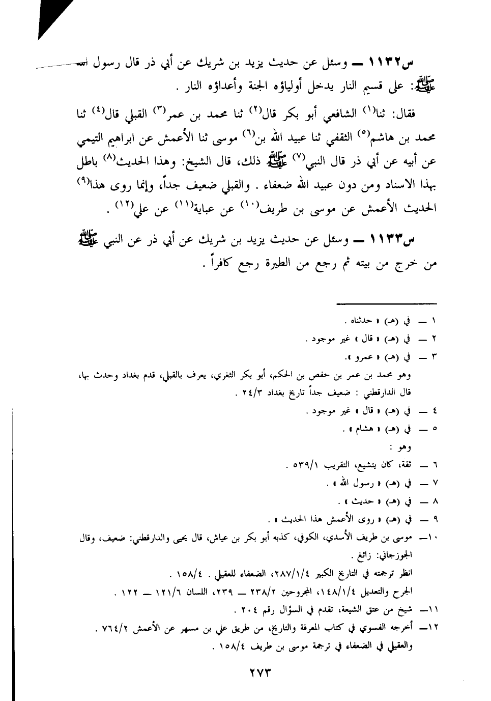 فقال: حدثنا الشافعي أبو بكر، قال: حدثنا محمد بن عمر القبلي، قال: حدثنا محمد بن هاشم الثقفي، حدثنا عبيد الله بن موسى حدثنا الأعمش، عن إبراهيم التيمي، عن أبيه، عن أَبِي ذَرٍّ، قَالَ