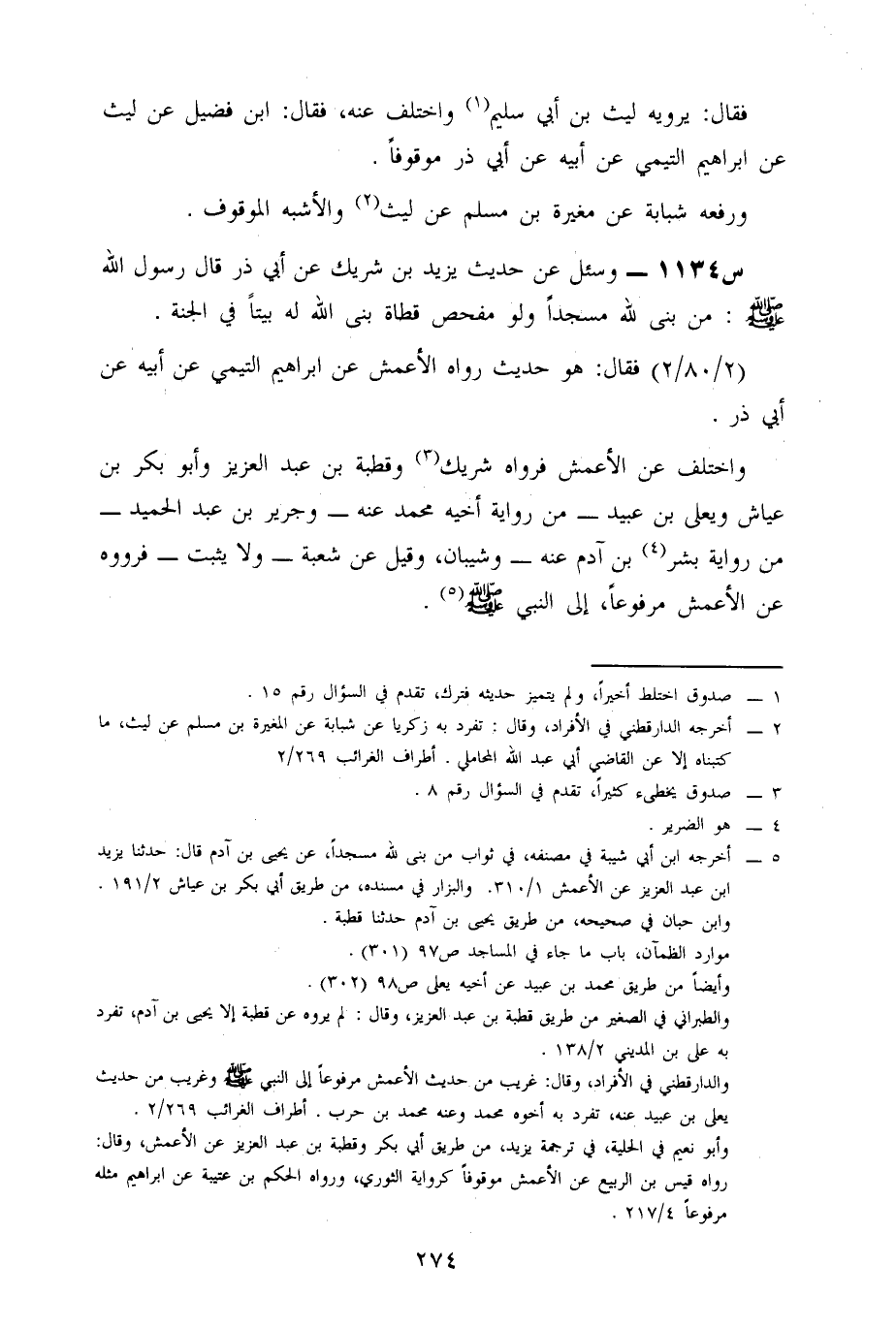 1134- وسئل عن حديث يزيد بن شريك، عن أَبِي ذَرٍّ، قَالَ رَسُولُ اللَّهِ صَلَّى اللَّهُ عَلَيْهِ وَسَلَّمَ: مَنْ بَنَى للَّهِ مَسْجِدًا وَلَوْ مَفْحَصَ قَطَاةِ بَنَى اللَّهُ لَهُ بَيْتًا فِي الْجَنَّةِ.