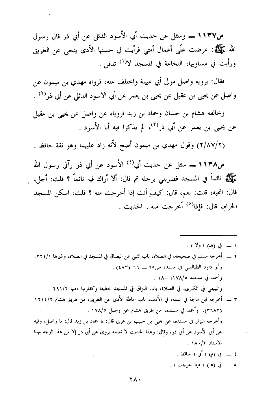 1137- وَسُئِلَ عَنْ حَدِيثِ أَبِي الْأَسْوَدِ الدُّؤَلِيِّ، عَنْ أَبِي ذَرٍّ، قَالَ رَسُولُ اللَّهِ صَلَّى اللَّهُ عَلَيْهِ وَسَلَّمَ: عُرِضَتْ عَلَيَّ أَعْمَالُ أُمَّتِي، فَرَأَيْتُ فِي حَسَنِهَا الْأَذَى (1) يُنَحَّى عَنِ الطَّرِيقِ، وَرَأَيْتُ فِي مَسَاوِيهَا النُّخَاعَةَ فِي الْمَسْجِدِ لَا تُدْفَنُ.
