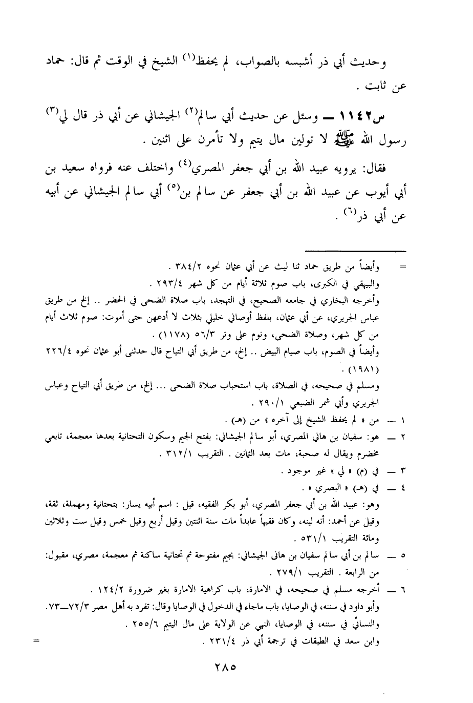 1142- وَسُئِلَ عَنْ حَدِيثِ أَبِي سَالِمٍ الْجَيْشَانِيِّ، عَنْ أبي ذر، قَالَ لِي رَسُولُ اللَّهِ صَلَّى اللَّهُ عَلَيْهِ وَسَلَّمَ: لَا تَوَلَّيَنَّ مَالَ يَتِيمٍ، وَلَا تَأَمَّرَنَّ عَلَى اثْنَيْنِ.