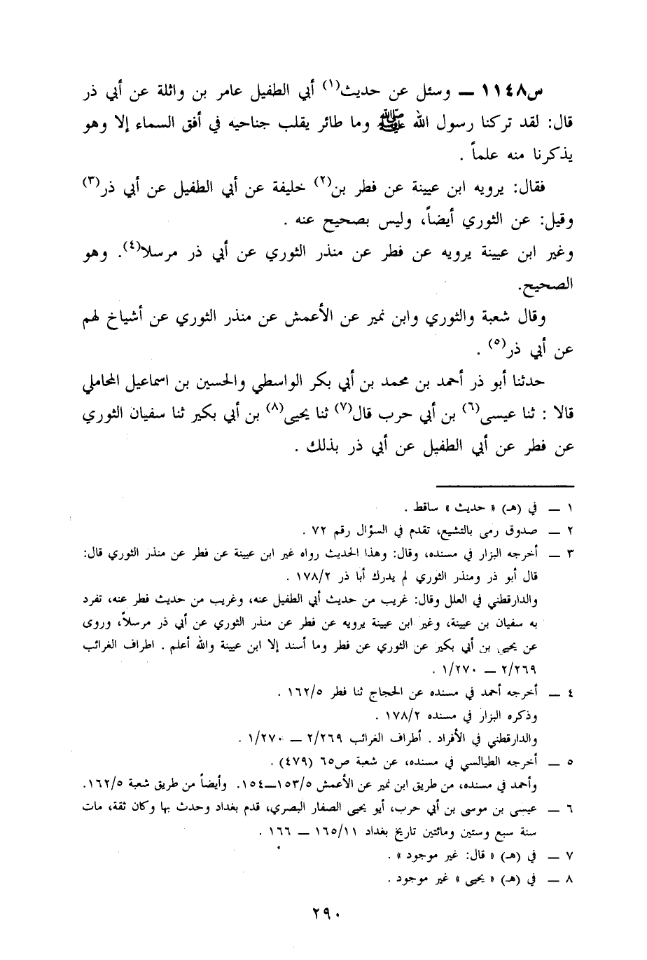 1148- وَسُئِلَ عَنْ حَدِيثِ أَبِي الطُّفَيْلِ عَامِرِ بْنِ وَاثِلَةَ، عَنْ أَبِي ذَرٍّ، قَالَ: لَقَدْ تَرَكَنَا رَسُولُ اللَّهِ صَلَّى اللَّهُ عَلَيْهِ وَسَلَّمَ، وَمَا طَائِرٌ يُقَلِّبُ جَنَاحَيْهِ فِي أُفُقِ السَّمَاءِ إِلَّا وَهُوَ يُذَكِّرُنَا مِنْهُ عِلْمًا.