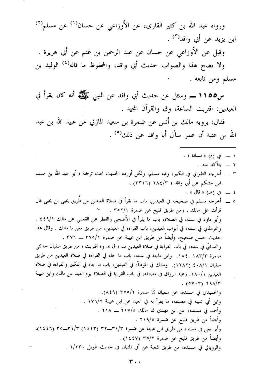 1155- وَسُئِلَ عَنْ حَدِيثِ أَبِي وَاقِدٍ، عن النَّبِيِّ صَلَّى اللَّهُ عَلَيْهِ وَسَلَّمَ؛ أَنَّهُ كَانَ يَقْرَأُ فِي الْعِيدَيْنِ: اقْتَرَبَتِ السَّاعَةُ، وق وَالْقُرْآنِ الْمَجِيدِ.