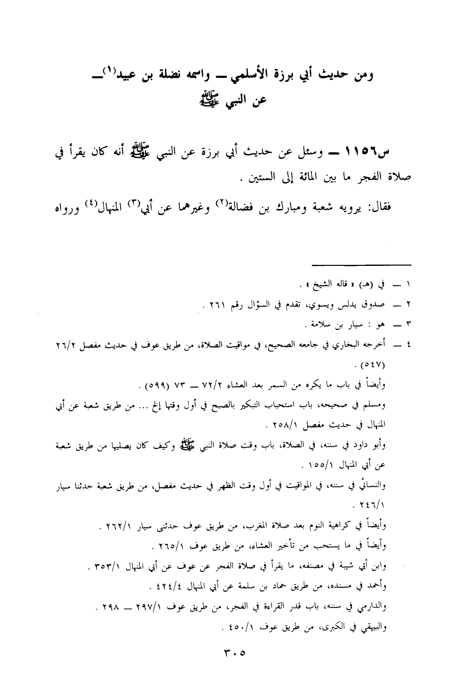 1156- وَسُئِلَ عن حديث أبي برزة، عن النَّبِيِّ صَلَّى اللَّهُ عَلَيْهِ وَسَلَّمَ؛ أَنَّهُ كَانَ يقرأ في صلاة الفجر ما بين المئة إِلَى السِّتِّينَ.