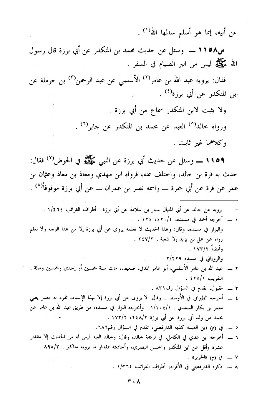 1158- وَسُئِلَ عَنْ حَدِيثِ مُحَمَّدِ بْنِ الْمُنْكَدِرِ، عَنْ أَبِي بَرْزَةَ، قَالَ رَسُولُ اللَّهِ صَلَّى اللَّهُ عَلَيْهِ وَسَلَّمَ: لَيْسَ مِنَ الْبِرِّ الصِّيَامُ فِي السَّفَرِ.