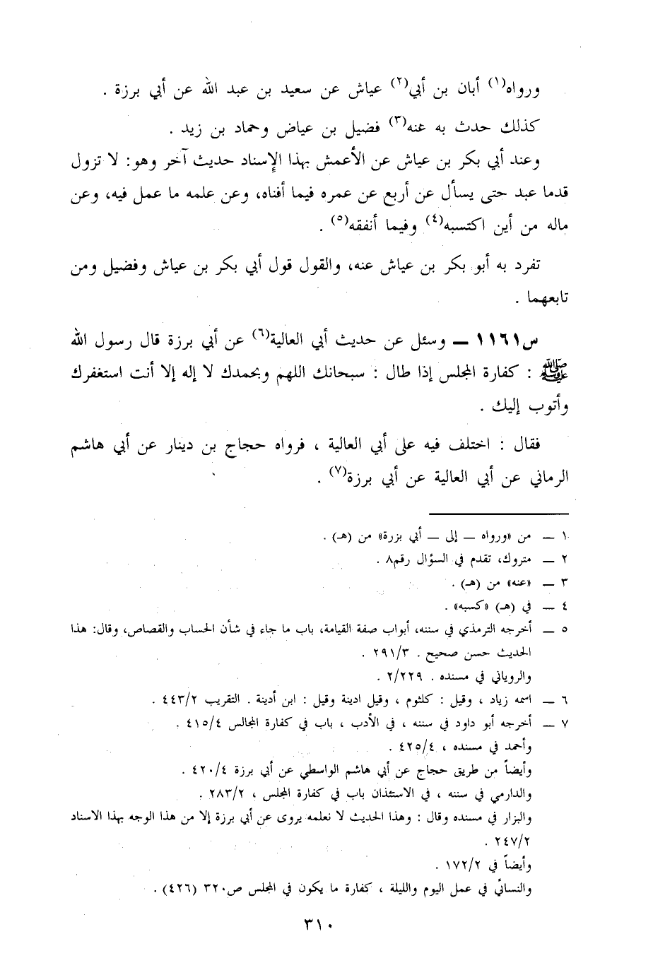 1161- وَسُئِلَ عَنْ حَدِيثِ أَبِي الْعَالِيَةِ، عَنْ أَبِي بَرْزَةَ، قَالَ رَسُولُ اللَّهِ صَلَّى اللَّهُ عَلَيْهِ وَسَلَّمَ: كَفَّارَةُ الْمَجْلِسِ إِذَا طَالَ: سُبْحَانَكَ اللَّهُمَّ وَبِحَمْدِكَ، لَا إِلَهَ إِلَّا أَنْتَ، أَسْتَغْفِرُكَ وَأَتُوبُ إِلَيْكَ.