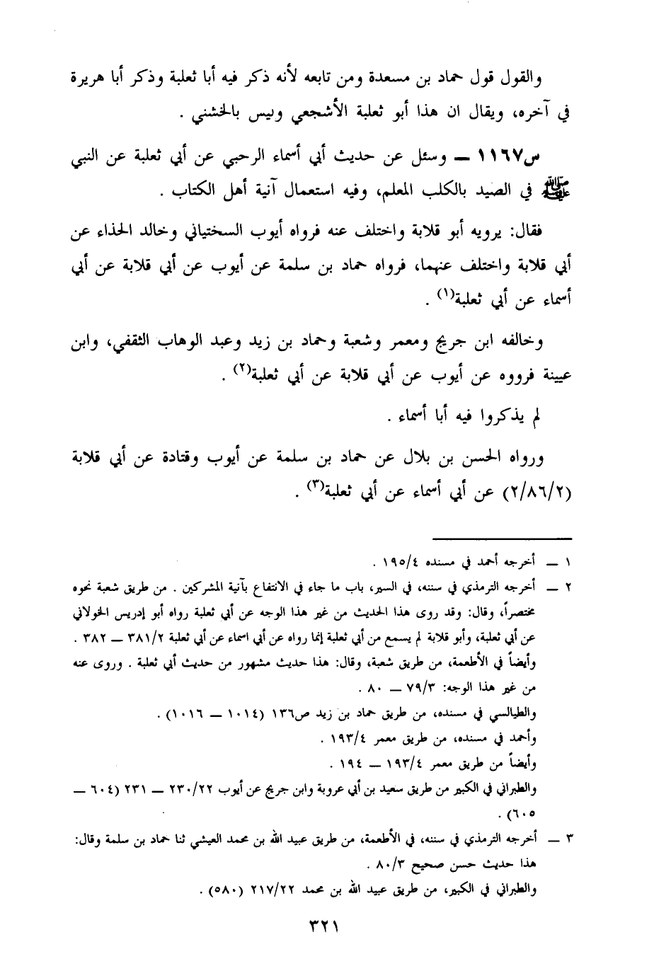 1167- وَسُئِلَ عَنْ حَدِيثِ أَبِي أَسْمَاءَ الرَّحْبِيِّ، عَنْ أَبِي ثَعْلَبَةَ، عَنِ النَّبِيِّ صَلَّى اللَّهُ عَلَيْهِ وَسَلَّمَ فِي الصَّيْدِ بِالْكَلْبِ الْمُعَلَّمِ، وَفِيهِ اسْتِعْمَالُ آنِيَةِ أَهْلِ الْكِتَابِ.