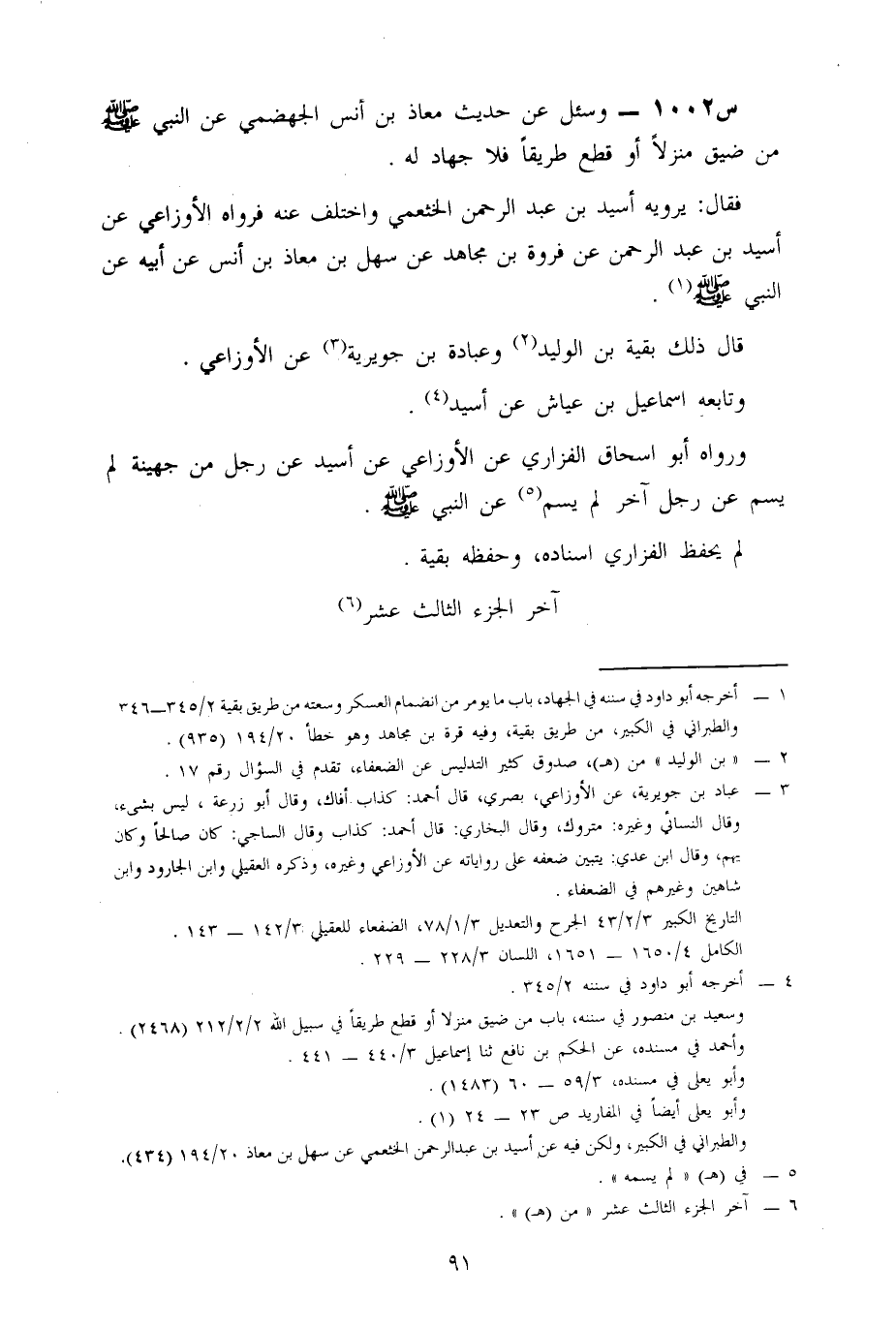 1002- وَسُئِلَ عَنْ حَدِيثِ مُعَاذِ بْنِ أَنَسٍ الْجَهْضَمِيِّ، عن النبي صلى الله عليه وسلم: من ضَيَّقَ مَنْزِلًا أَوْ قَطَعَ طَرِيقًا، فَلَا جِهَادَ لَهُ.