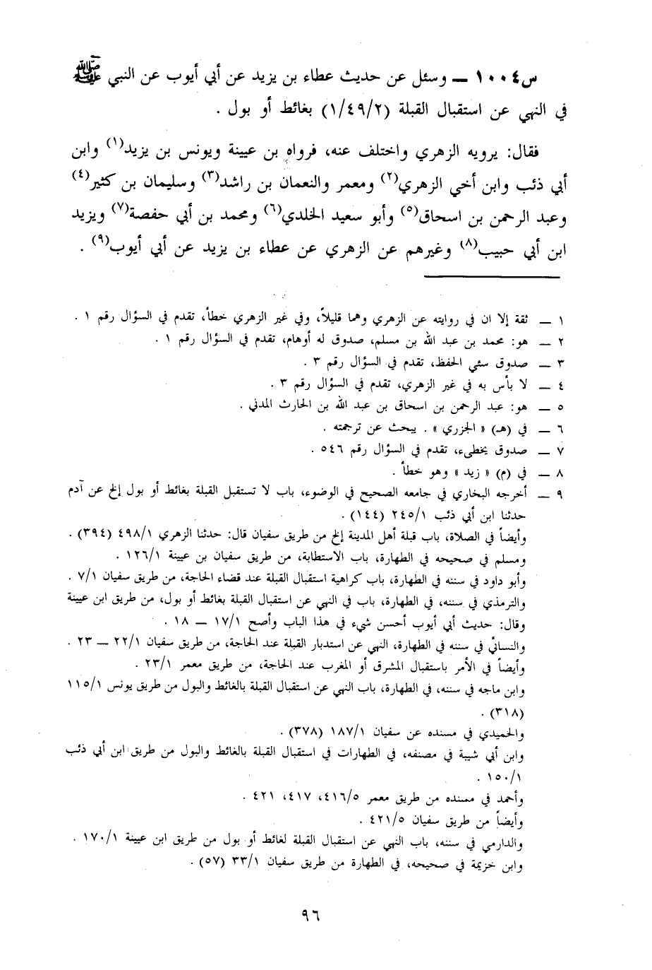 1004- وَسُئِلَ عَنْ حَدِيثِ عَطَاءِ بْنِ يَزِيدَ، عَنْ أَبِي أَيُّوبَ، عَنِ النَّبِيِّ صَلَّى اللَّهُ عَلَيْهِ وَسَلَّمَ؛ فِي النَّهْيِ عَنِ اسْتِقْبَالِ الْقِبْلَةِ بِغَائِطٍ أَوْ بَوْلٍ.
