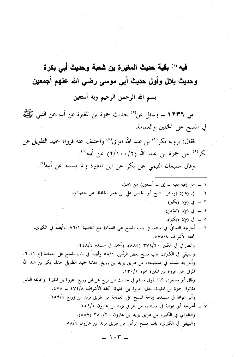 1236- وَسُئِلَ عَنْ حَدِيثِ حَمْزَةَ بْنِ الْمُغِيرَةِ، عَنْ أَبِيهِ، عَنِ النَّبِيِّ صَلَّى اللَّهُ عَلَيْهِ وَسَلَّمَ فِي الْمَسْحِ عَلَى الْخُفَّيْنِ وَالْعِمَامَةِ.