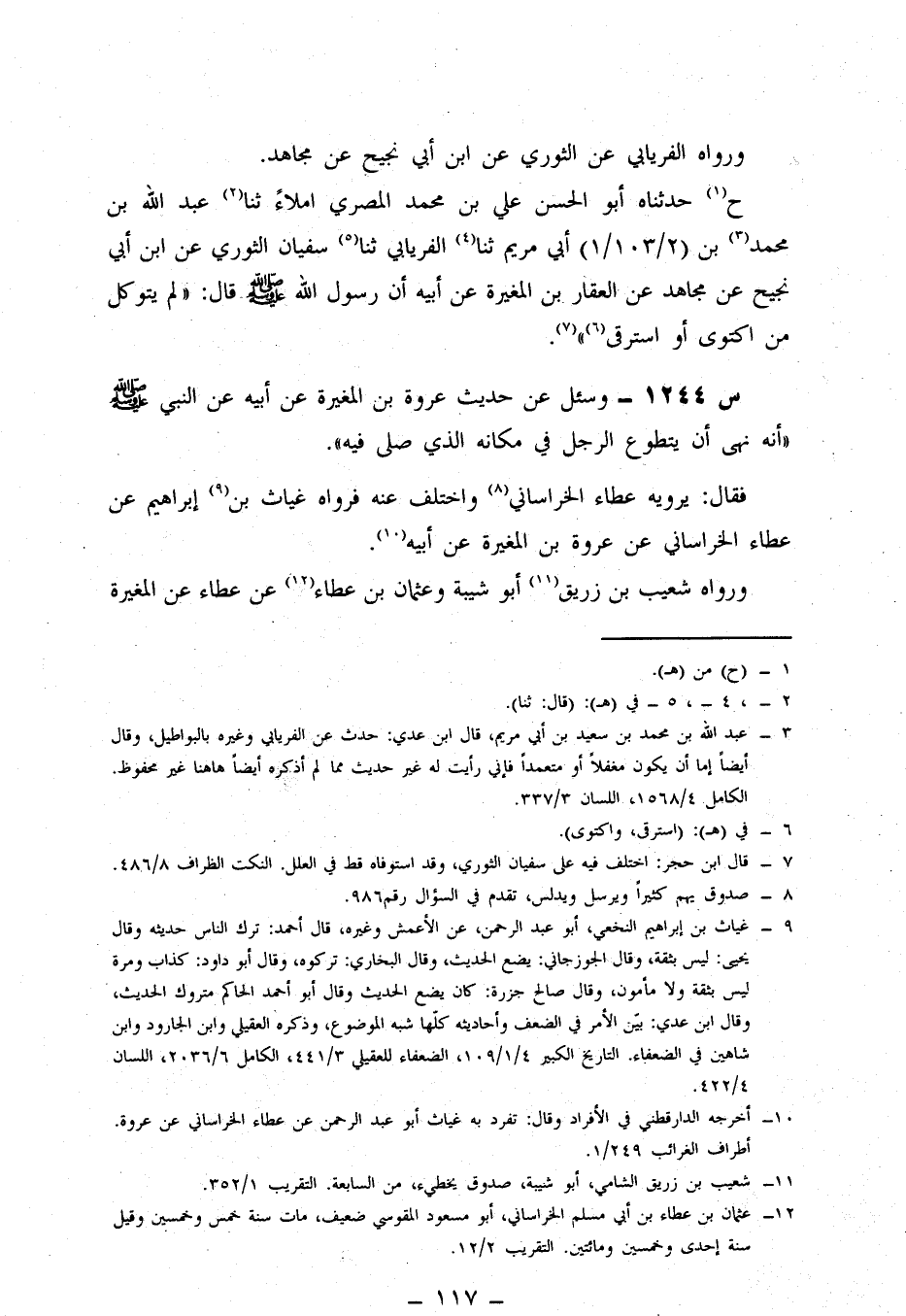 وَرَوَاهُ الْفِرْيَابِيُّ، عَنِ الثَّوْرِيِّ، عَنِ ابْنِ أَبِي نَجِيحٍ، عَنْ مُجَاهِدٍ (ح) ، حَدَّثَنَاهُ أَبُو الْحَسَنِ علي بن محمد المصري إملاء، حَدَّثَنَا عَبْدُ اللَّهِ بْنُ مُحَمَّدِ بْنِ أَبِي مريم، حدثنا الفريابي، حدثنا سُفْيَانُ الثَّوْرِيُّ، عَنِ ابْنِ أَبِي نَجِيحٍ، عَنْ مُجَاهِدٍ، عَنِ الْعَقَّارِ بْنِ الْمُغِيرَةِ، عَنْ أَبِيهِ؛ أَنَّ رَسُولَ اللَّهِ صَلَّى اللَّهُ عليه وسلم، قَالَ: لَمْ يَتَوَكَّلْ مَنِ اكْتَوَى أَوِ اسْتَرْقَى.