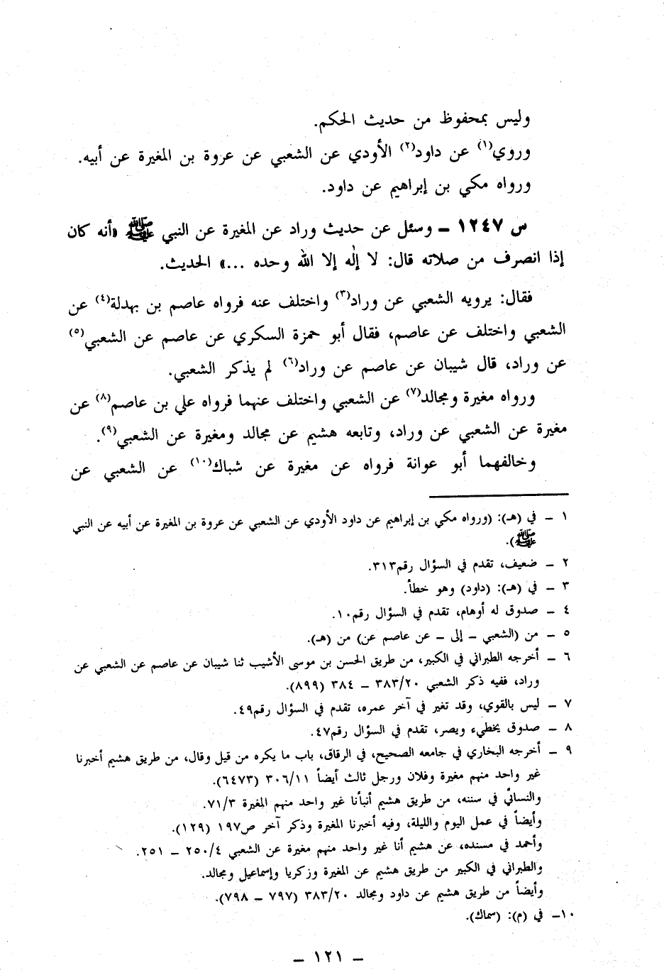 1247- وَسُئِلَ عَنْ حَدِيثِ وَرَّادٍ، عَنِ الْمُغِيرَةِ، عَنِ النَّبِيِّ صَلَّى اللَّهُ عَلَيْهِ وَسَلَّمَ؛ أَنَّهُ كَانَ إِذَا انْصَرَفَ مِنْ صَلَاتِهِ قَالَ لَا إِلَهَ إِلَّا اللَّهُ وَحْدَهُ ... الْحَدِيثَ.
