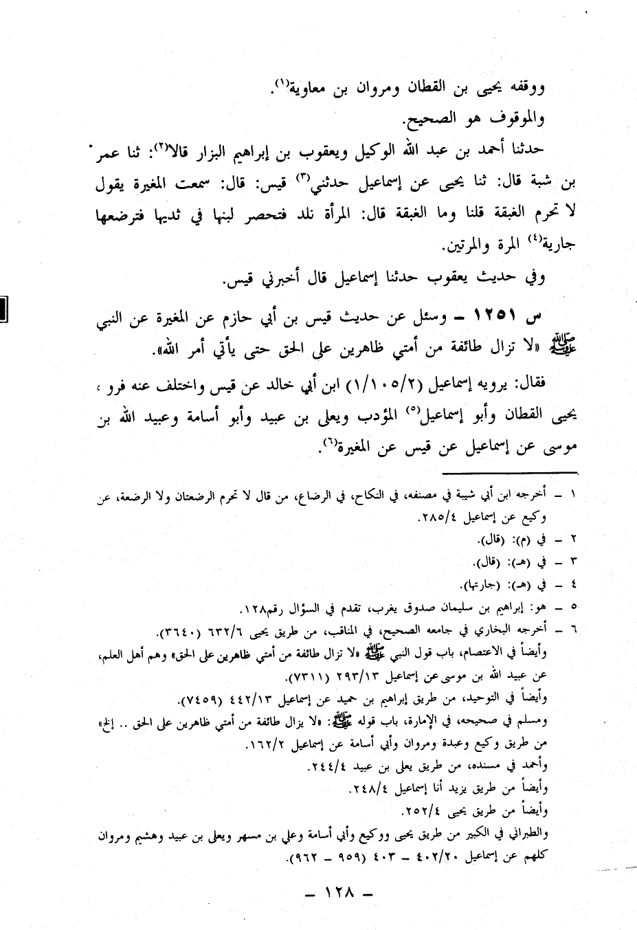 1251- وَسُئِلَ عَنْ حَدِيثِ قَيْسِ بْنِ أَبِي حَازِمٍ، عَنِ الْمُغِيرَةِ، عَنِ النَّبِيِّ صَلَّى اللَّهُ عَلَيْهِ وَسَلَّمَ: لَا تَزَالُ طَائِفَةٌ مِنْ أُمَّتِي ظَاهِرِينَ عَلَى الْحَقِّ حَتَّى يَأْتِيَ أَمْرُ اللَّهِ.
