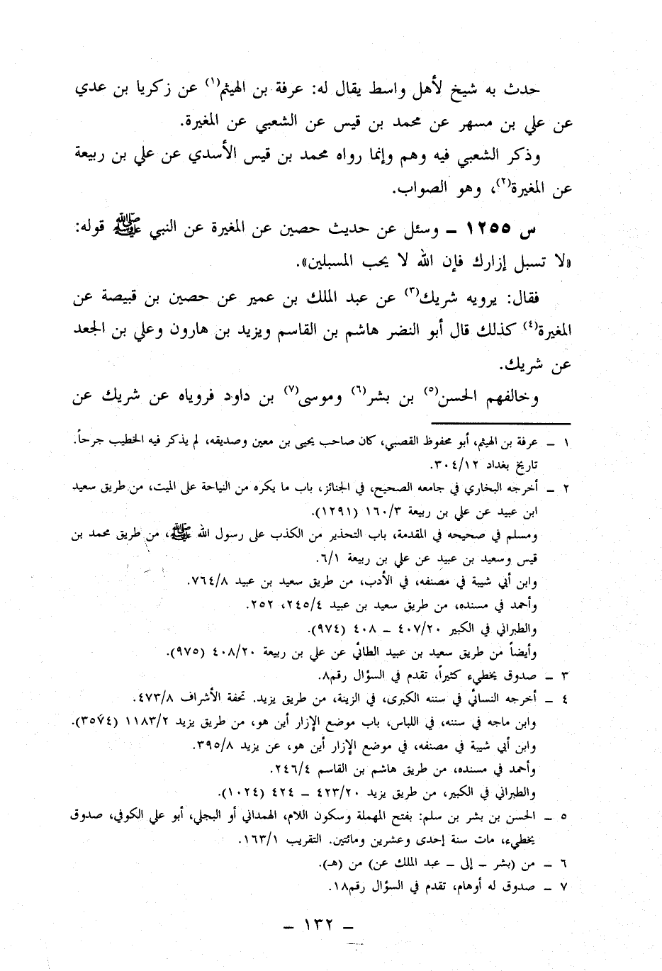 1255- وسئل عَنْ حَدِيثِ حُصَيْنٍ، عَنِ الْمُغِيرَةِ، عَنِ النَّبِيِّ صَلَّى اللَّهُ عَلَيْهِ وَسَلَّمَ قَوْلِهِ: لَا تَسْبِلْ إِزَارَكَ فَإِنَّ اللَّهَ لَا يُحِبُّ الْمُسْبِلِينَ.