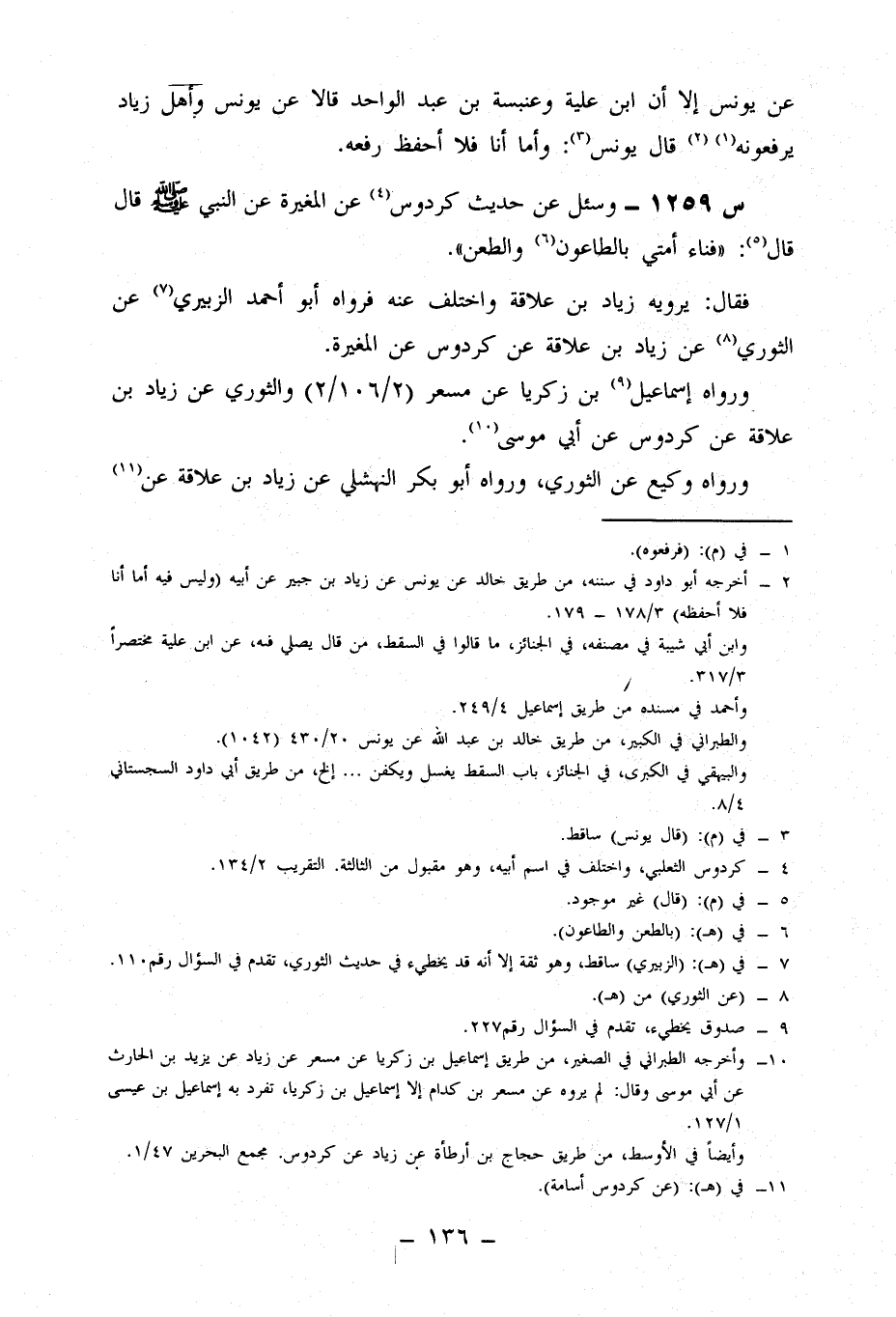1259- وَسُئِلَ عَنْ حَدِيثِ كُرْدُوسٍ، عَنِ الْمُغِيرَةِ، عَنِ النَّبِيِّ صَلَّى اللَّهُ عَلَيْهِ وَسَلَّمَ قَالَ: قَالَ: فَنَاءُ أُمَّتِي بِالطَّاعُونِ، وَالطَّعْنِ.