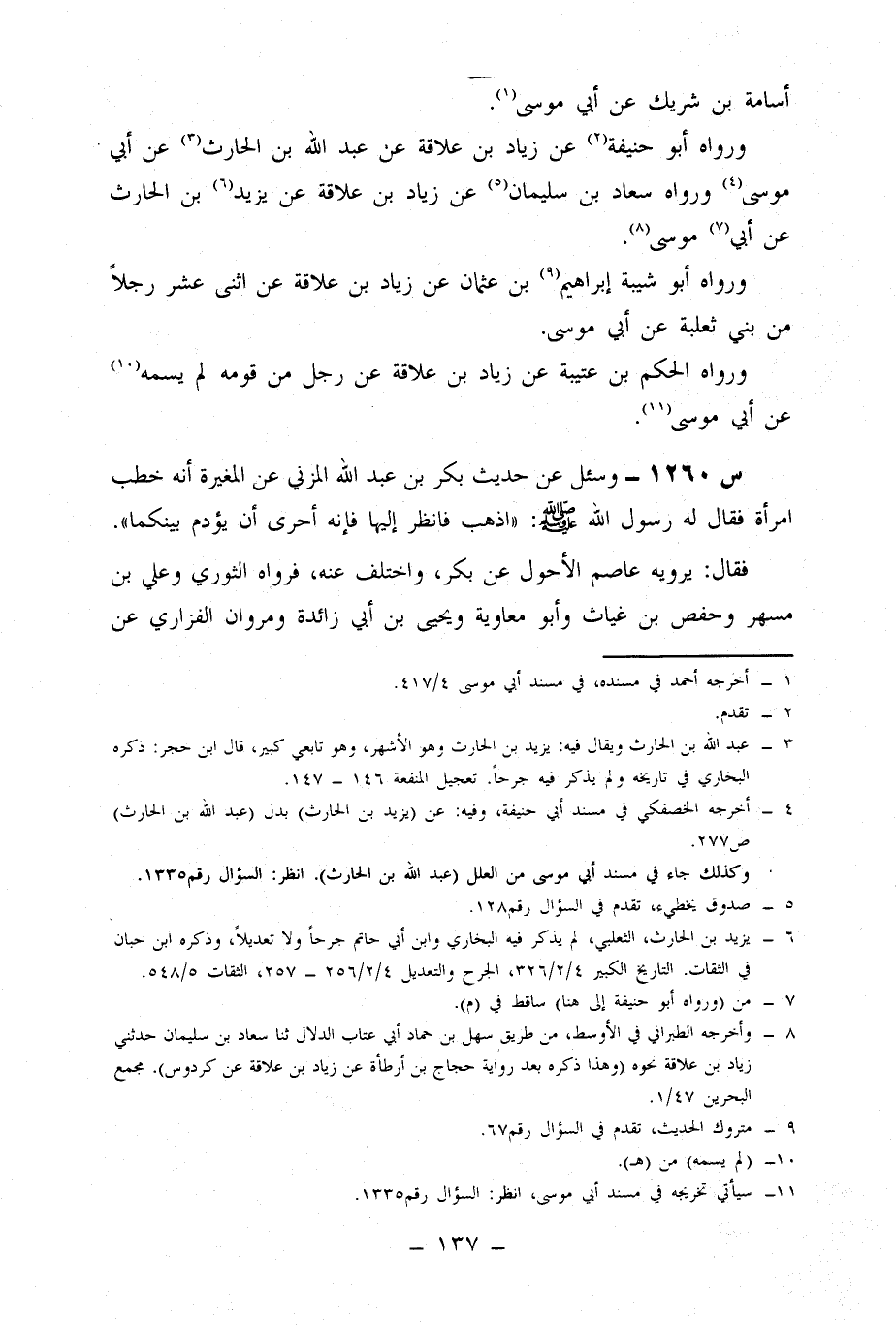 1260- وَسُئِلَ عَنْ حَدِيثِ بَكْرِ بْنِ عَبْدِ اللَّهِ الْمُزَنِيِّ، عَنِ الْمُغِيرَةِ أَنَّهُ خَطَبَ امْرَأَةً، فَقَالَ لَهُ رَسُولُ اللَّهِ صَلَّى اللَّهُ عَلَيْهِ وَسَلَّمَ: اذْهَبْ فَانْظُرْ إِلَيْهَا فَإِنَّهُ أَحْرَى أَنْ يُؤْدَمَ بَيْنَكُمَا.