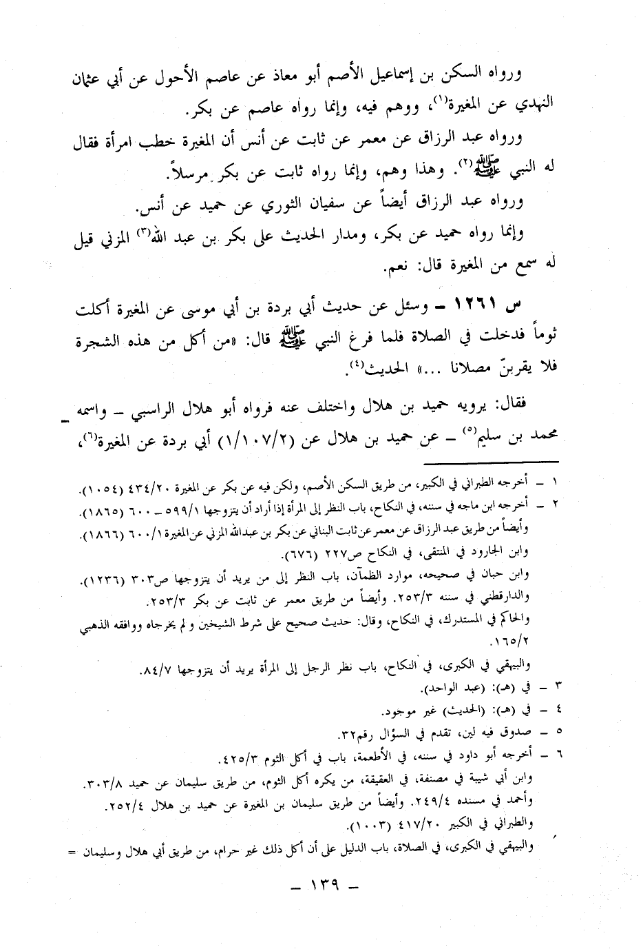 1261- وَسُئِلَ عَنْ حَدِيثِ أَبِي بُرْدَةَ بْنِ أَبِي مُوسَى، عَنِ الْمُغِيرَةِ أَكَلْتُ ثَوْمًا، فَدَخَلْتُ فِي الصَّلَاةِ فَلَمَّا فَرَغَ النَّبِيُّ صَلَّى اللَّهُ عَلَيْهِ وَسَلَّمَ، قَالَ: مَنْ أَكَلَ مِنْ هَذِهِ الشَّجَرَةِ فَلَا يَقْرُبَنَّ مُصَلَّانَا ... الْحَدِيثَ.