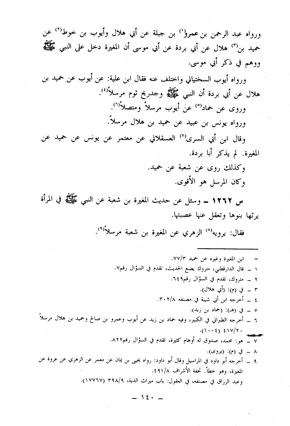 1262- وَسُئِلَ عَنْ حَدِيثِ الْمُغِيرَةِ بْنِ شُعْبَةَ، عَنِ النَّبِيِّ صَلَّى اللَّهُ عَلَيْهِ وَسَلَّمَ؛ فِي الْمَرْأَةِ يَرِثُهَا بَنُوهَا وَتَعْقِلُ عَنْهَا عُصْبَتُهَا.