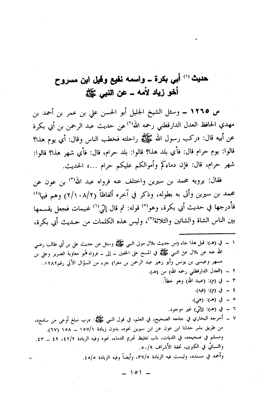 1265- وَسُئِلَ الشَّيْخُ الْجَلِيلُ أَبُو الْحَسَنِ عَلِيُّ بْنُ عُمَرَ بْنِ أَحْمَدَ بن مَهْدِيٍّ الْحَافِظُ الْعَدْلُ الدَّارَقُطْنِيُّ رَحِمَهُ اللَّهُ عَنْ حَدِيثِ عَبْدِ الرَّحْمَنِ بْنِ أَبِي بَكْرَةَ، عَنْ أَبِيهِ، قَالَ: رَكِبَ رَسُولُ اللَّهِ صَلَّى اللَّهُ عَلَيْهِ وَسَلَّمَ رَاحِلَتَهُ فَخَطَبَ النَّاسَ، وَقَالَ: أَيُّ يَوْمٍ هَذَا؟ قَالُوا: يَوْمٌ حَرَامٌ، قَالَ: فَأَيُّ بَلَدٍ هَذَا؟ قَالُوا: بَلَدٌ حَرَامٌ، قَالَ: فَأَيُّ شَهْرٍ هَذَا؟ قَالُوا: شَهْرٌ حَرَامٌ، قَالَ: فَإِنَّ دِمَاءَكُمْ وَأَمْوَالَكُمْ عَلَيْكُمْ حَرَامٌ ... الْحَدِيثَ.