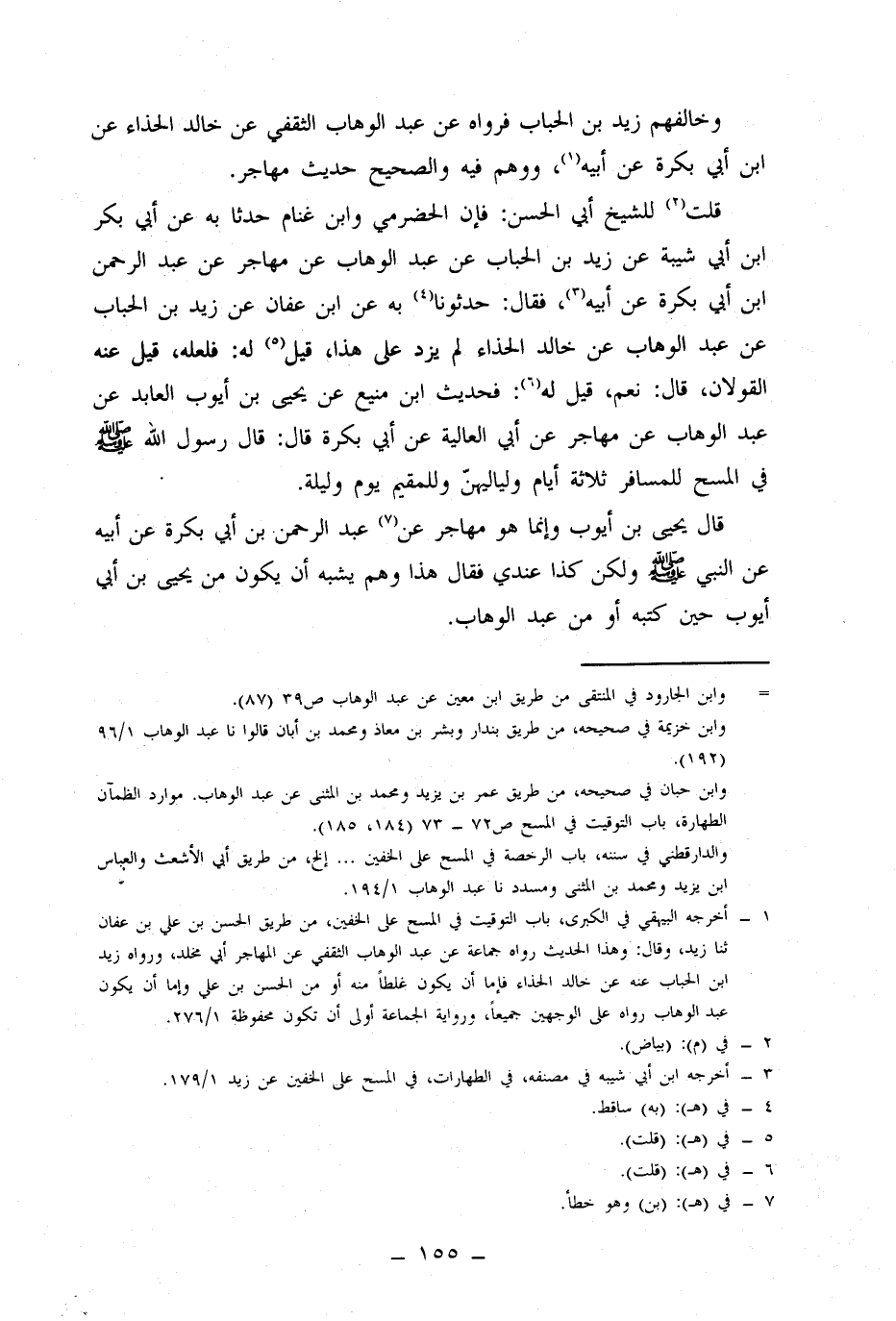 قُلْتُ لِلشَّيْخِ أَبِي الْحَسَنِ: فإن الحضرمي، وابن غنام حدثا به عن أبي بكر بن أبي شيبة عن زَيْدِ بْنِ الْحُبَابِ، عَنْ عَبْدِ الْوَهَّابِ، عَنْ مهاجر، عَنْ عَبْدِ الرَّحْمَنِ بْنِ أَبِي بَكْرَةَ، عَنْ أَبِيهِ، فَقَالَ: حَدَّثُونَا بِهِ عَنِ ابْنِ عَفَّانَ، عَنْ زَيْدِ بْنِ الْحُبَابِ، عَنْ عَبْدِ الْوَهَّابِ، عَنْ خَالِدٍ الْحَذَّاءِ، لَمْ يَزِدْ عَلَى هَذَا، قِيلَ لَهُ: فَلَعَلَّهُ قِيلَ عَنْهُ الْقَوْلَانِ، قَالَ: نَعَمْ، قِيلَ لَهُ: فَحَدِيثُ ابْنِ مَنِيعٍ، عَنْ يَحْيَى بْنِ أَيُّوبَ الْعَابِدِ، عَنْ عَبْدِ الْوَهَّابِ، عَنْ مُهَاجِرٍ، عَنْ أَبِي الْعَالِيَةِ، عَنْ أَبِي بَكْرَةَ، قَالَ: قَالَ رَسُولُ اللَّهِ صَلَّى اللَّهُ عَلَيْهِ وَسَلَّمَ فِي الْمَسْحِ لِلْمُسَافِرِ ثَلَاثَةُ أَيَّامٍ وَلَيَالِيهِنَّ وَلِلْمُقِيمِ يَوْمٌ وَلَيْلَةٌ.