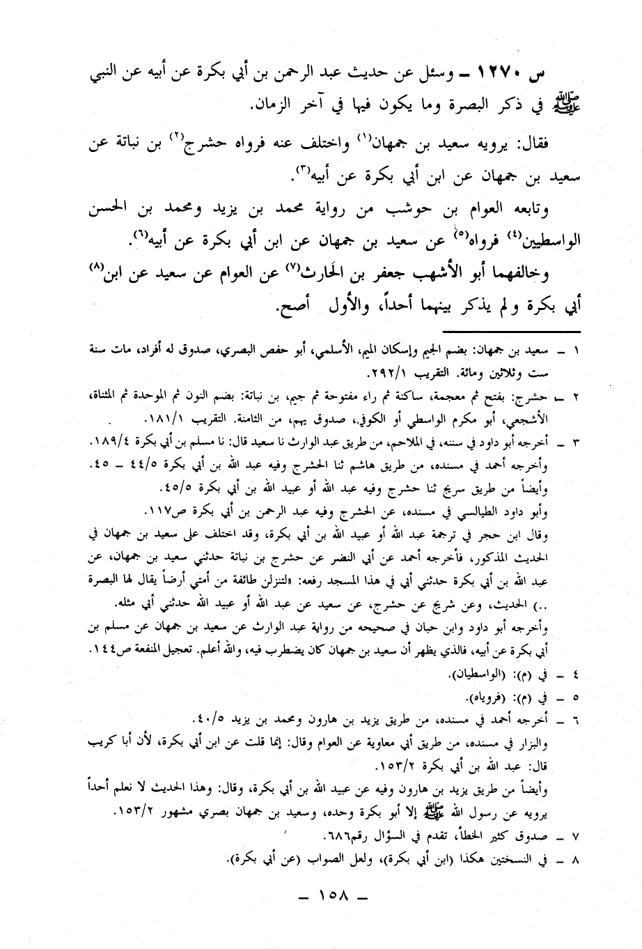 1270- وَسُئِلَ عَنْ حَدِيثِ عَبْدِ الرَّحْمَنِ بْنِ أَبِي بَكْرَةَ، عَنْ أَبِيهِ، عَنِ النَّبِيِّ صَلَّى اللَّهُ عَلَيْهِ وَسَلَّمَ فِي ذِكْرِ الْبَصْرَةِ، وَمَا يَكُونُ فِيهَا فِي آخِرِ الزَّمَانِ.