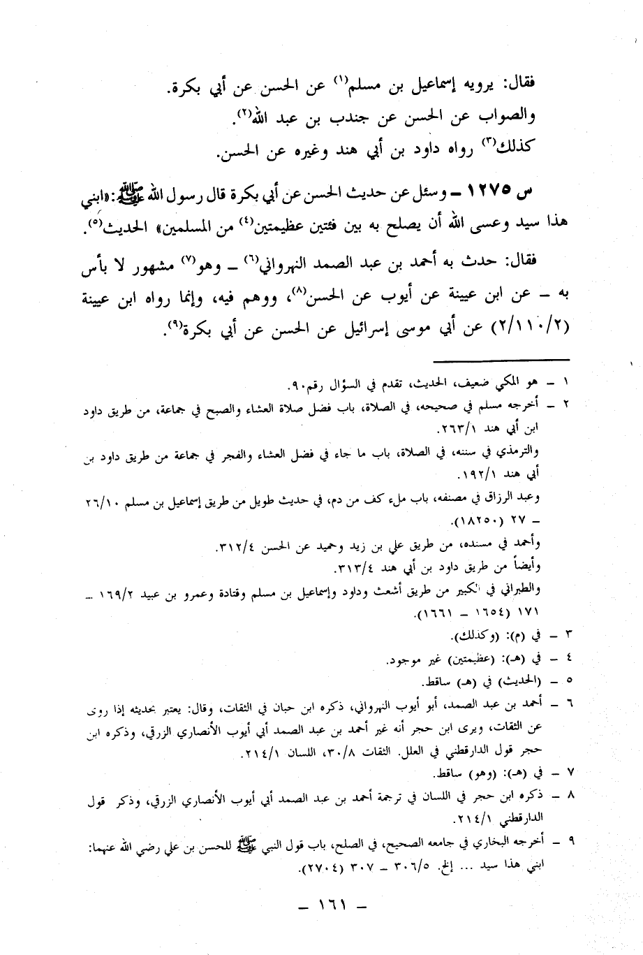 1275- وَسُئِلَ عَنْ حَدِيثِ الْحَسَنِ، عَنْ أَبِي بَكْرَةَ، قَالَ رَسُولُ اللَّهِ صَلَّى اللَّهُ عَلَيْهِ وَسَلَّمَ: ابْنِي هَذَا سَيِّدٌ وَعَسَى اللَّهُ أَنْ يُصْلِحَ بِهِ بَيْنَ فِئَتَيْنِ عَظِيمَتَيْنِ مِنَ الْمُسْلِمِينَ ... الْحَدِيثَ.