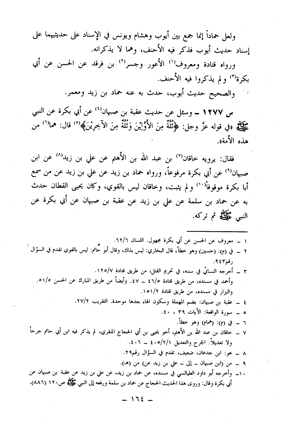1277- وَسُئِلَ عَنْ حَدِيثِ عُقْبَةَ بْنِ صُبْهَانَ، عَنْ أَبِي بَكْرَةَ، عَنِ النَّبِيِّ صَلَّى اللَّهُ عَلَيْهِ وَسَلَّمَ فِي قَوْلِهِ عَزَّ وَجَلَّ: {ثُلَّةٌ مِنَ الأولين وثلة من الآخرين} قَالَ: هُمَا مِنْ هَذِهِ الْأُمَّةِ.