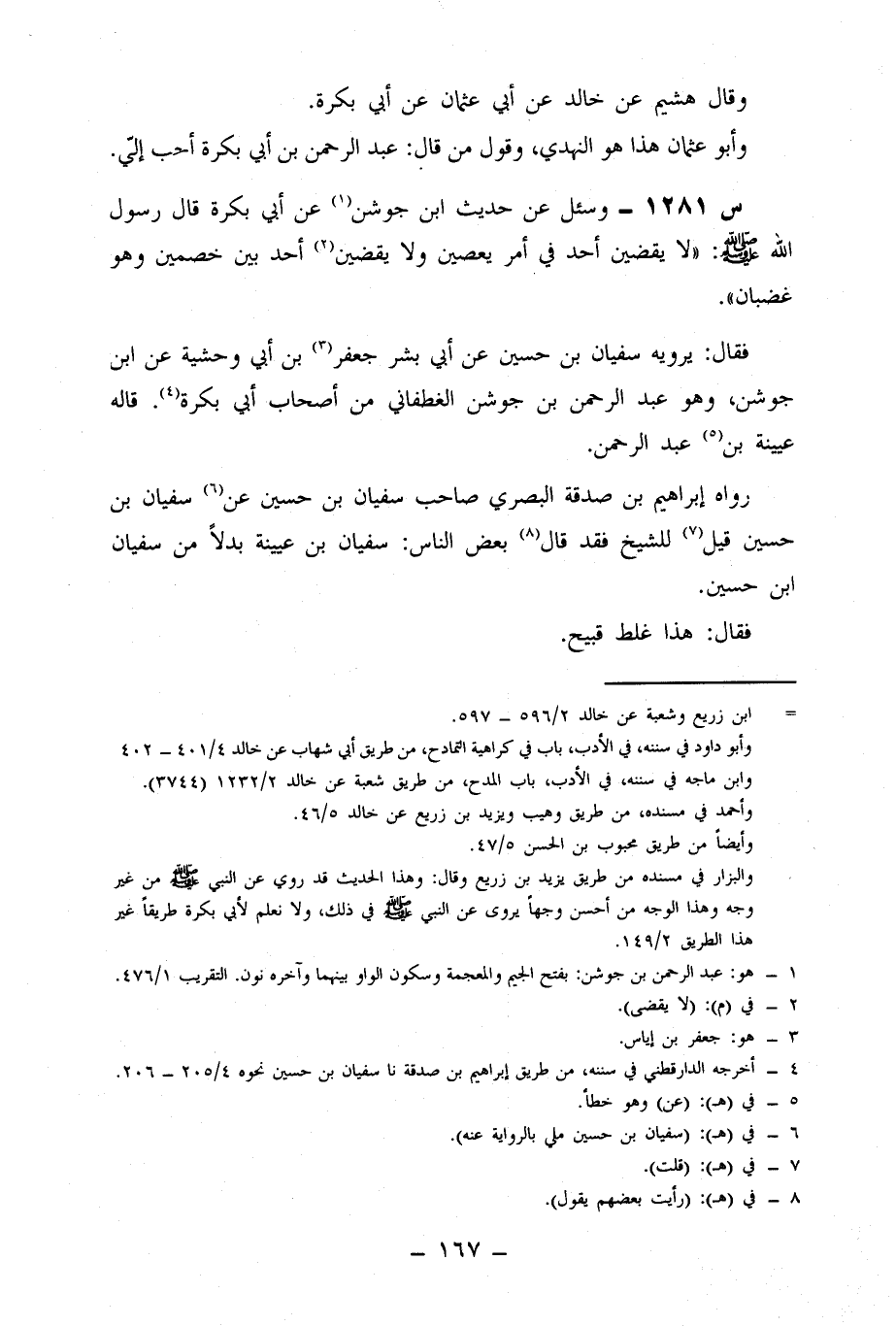 1281- وَسُئِلَ عَنْ حَدِيثِ بْنِ جَوْشَنٍ، عَنْ أَبِي بَكْرَةَ، قَالَ رَسُولُ اللَّهِ صَلَّى اللَّهُ عَلَيْهِ وَسَلَّمَ: لَا يَقْضِيَنَّ أَحَدٌ فِي أَمْرٍ يَعْصِيَنَّ، وَلَا يَقْضِيَنَّ أَحَدٌ بَيْنَ خَصْمَيْنِ وَهُوَ غَضْبَانُ.