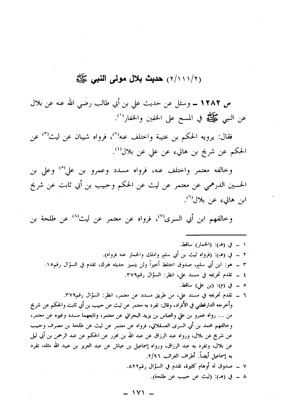 1282- وَسُئِلَ عَنْ حَدِيثِ عَلِيِّ بْنِ أَبِي طَالِبٍ رَضِيَ اللَّهُ تَعَالَى عَنْهُ، عَنْ بِلَالٍ، عَنِ النَّبِيِّ صَلَّى اللَّهُ عَلَيْهِ وَسَلَّمَ فِي الْمَسْحِ عَلَى الْخُفَّيْنِ وَالْخِمَارِ (1) .