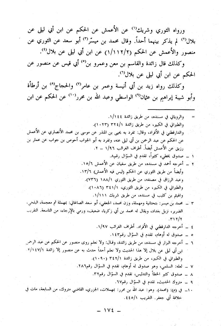 وكذلك رواه زيد بن أبي أُنَيْسَةَ، وَعُمَرُ بْنُ عَامِرٍ، وَالْحَجَّاجُ بْنُ أَرْطَأَةَ، وأبو شيبة إبراهيم بن عثمان الواسطي، وَعَبْدُ اللَّهِ بْنُ مُحَرِّرٍ، عَنِ الْحَكَمِ، عَنِ ابْنِ أَبِي لَيْلَى، عَنْ بِلَالٍ.