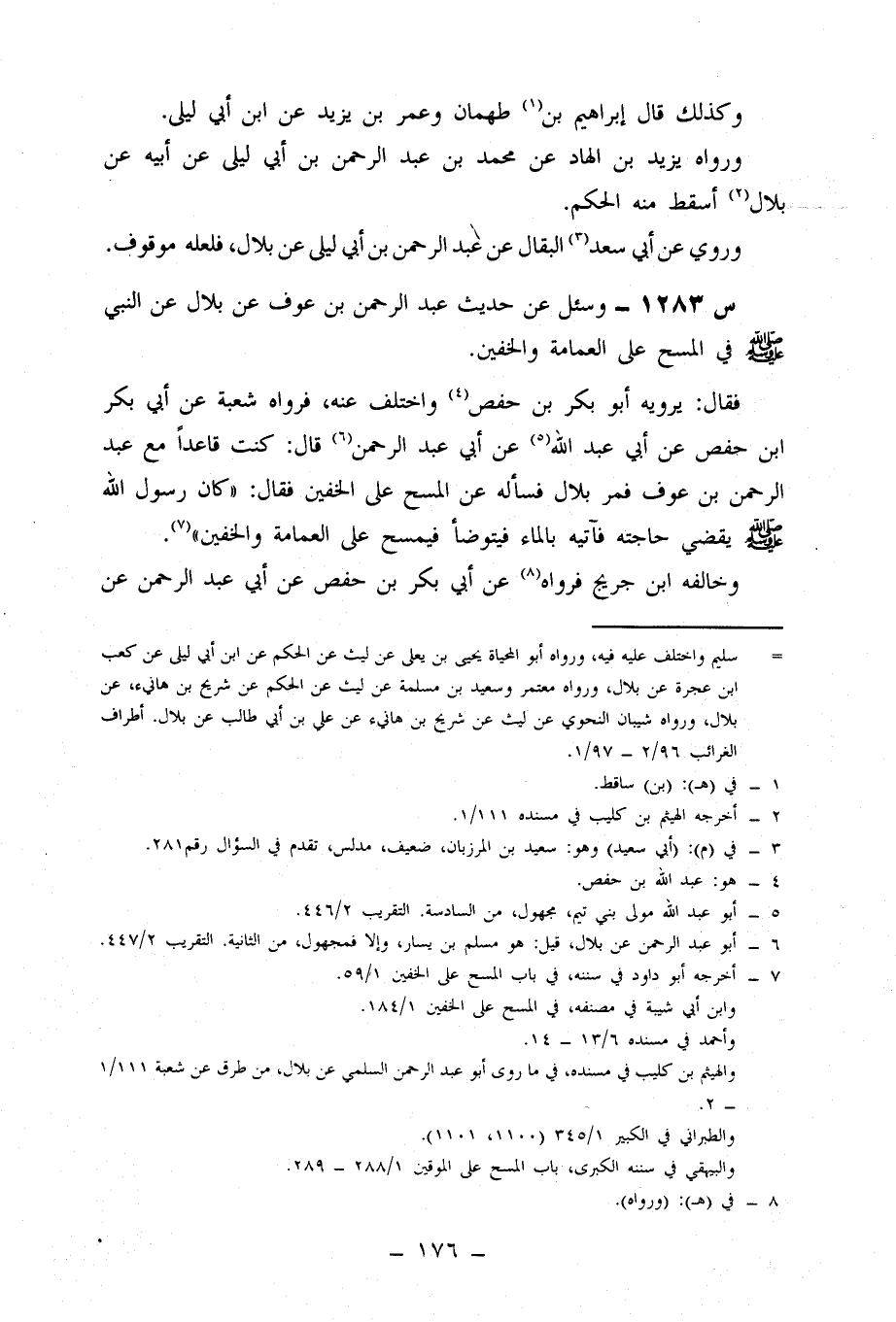 1283- وَسُئِلَ عَنْ حَدِيثِ عَبْدِ الرَّحْمَنِ بْنِ عَوْفٍ، عَنْ بِلَالٍ، عَنِ النَّبِيِّ صَلَّى اللَّهُ عَلَيْهِ وَسَلَّمَ فِي الْمَسْحِ عَلَى الْعِمَامَةِ وَالْخُفَّيْنِ.