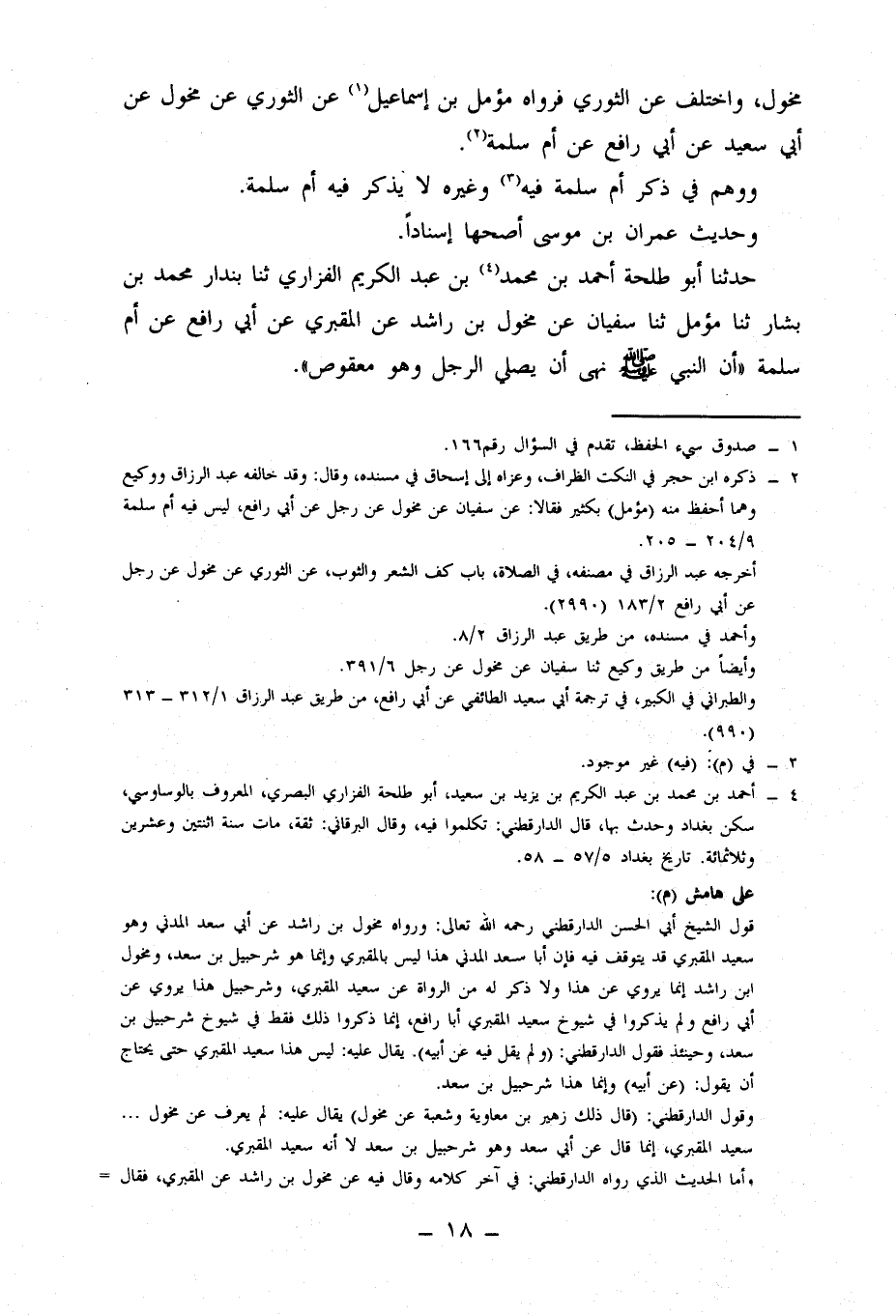 حدثنا أبو طَلْحَةُ أَحْمَدُ بْنُ مُحَمَّدِ بْنِ عَبْدِ الْكَرِيمِ الفزاري، حدثنا بندار محمد بن بشار، حدثنا مؤمل، حدثنا سُفْيَانُ، عَنْ مُخَوَّلِ بْنِ رَاشِدٍ، عَنِ الْمَقْبُرِيِّ، عَنْ أَبِي رَافِعٍ، عَنْ أُمِّ سَلَمَةَ: أَنّ النَّبِيَّ صَلَّى اللَّهُ عَلَيْهِ وَسَلَّمَ: نَهَى أَنْ يُصَلِّيَ الرَّجُلُ وَهُوَ مَعْقُوصٌ.