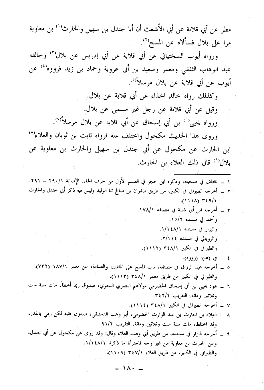 فَرَوَاهُ ثَابِتُ بْنُ ثَوْبَانَ، وَالْعَلَاءُ بْنُ الْحَارِثِ، عَنْ مَكْحُولٍ، عَنْ أَبِي جَنْدَلِ بْنِ سُهَيْلٍ، وَالْحَارِثِ بْنِ مُعَاوِيَةَ، عَنْ بِلَالٍ، قَالَ ذَلِكَ الْعَلَاءُ بْنُ الحارث.