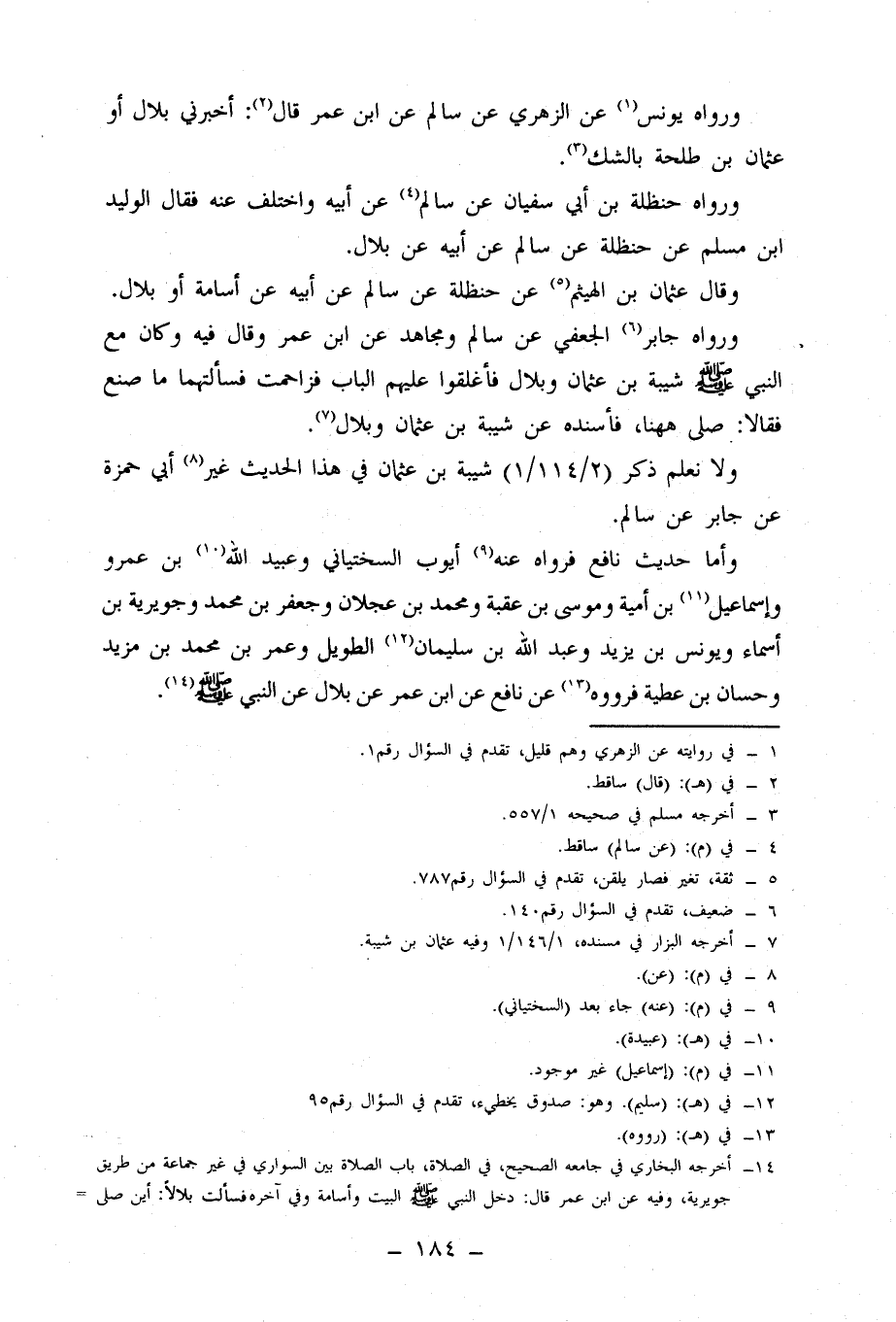 وَأَمَّا حَدِيثُ نَافِعٍ، فَرَوَاهُ عَنْهُ أَيُّوبُ السَّخْتِيَانِيُّ، وَعُبَيْدُ اللَّهِ بْنُ عَمْرٍو، وَإِسْمَاعِيلُ بْنُ أُمَيَّةَ، وَمُوسَى بْنُ عُقْبَةَ، وَمُحَمَّدُ بْنُ عَجْلَانَ، وَجَعْفَرُ بْنُ مُحَمَّدٍ، وَجُوَيْرِيَةُ بْنُ أَسْمَاءَ، وَيُونُسُ بْنُ يَزِيدَ، وَعَبْدُ اللَّهِ بْنُ سُلَيْمَانَ الطَّوِيلُ، وَعُمَرُ بْنُ مُحَمَّدِ بْنِ مَزْيَدٍ، وَحَسَّانُ بْنُ عَطِيَّةَ، فَرَوَوْهُ عَنْ نَافِعٍ، عَنِ ابْنِ عُمَرَ، عَنْ بِلَالٍ، عَنِ النَّبِيِّ صَلَّى اللَّهُ عَلَيْهِ وَسَلَّمَ.