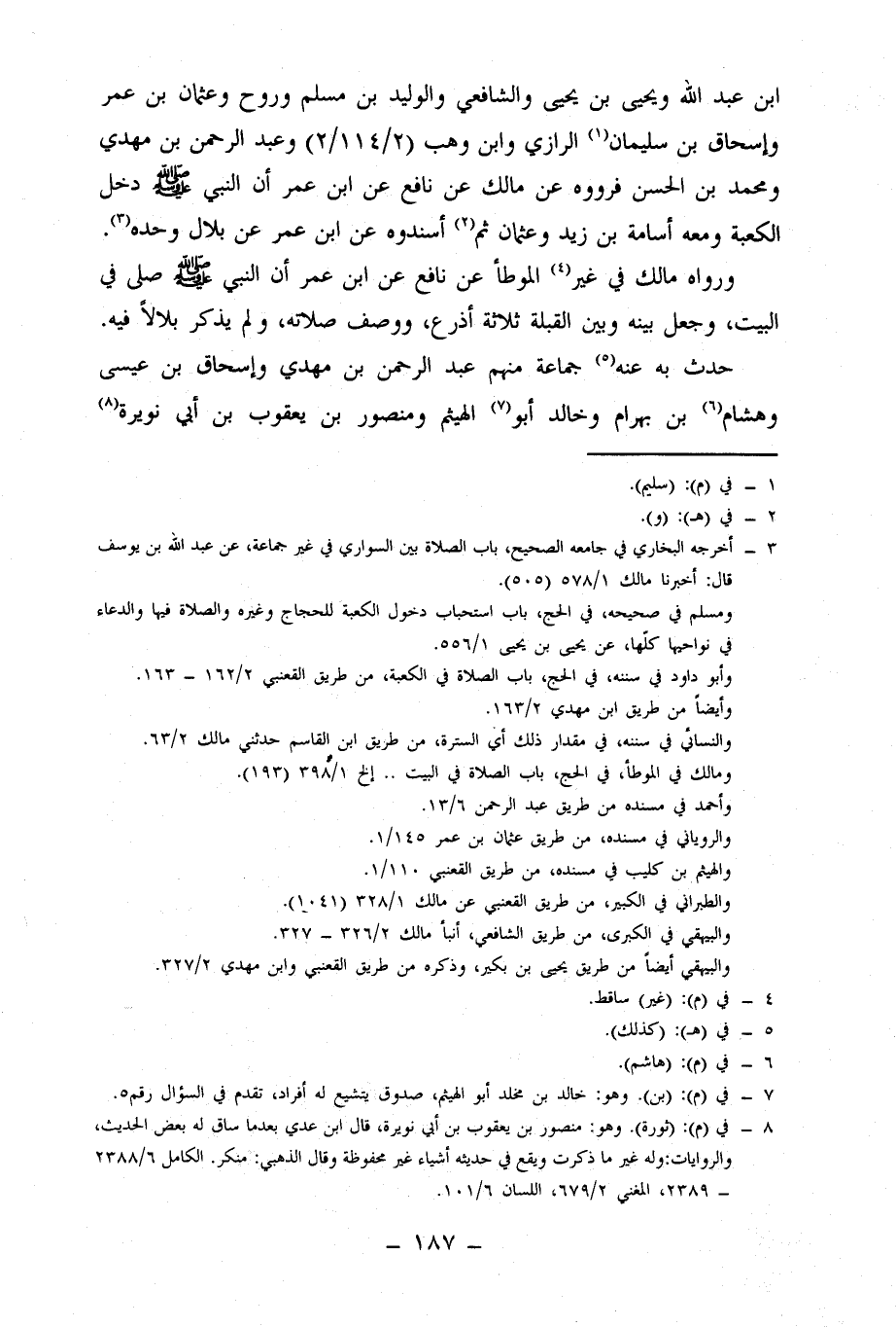 حدث به عنه جَمَاعَةٌ؛ مِنْهُمْ: عَبْدُ الرَّحْمَنِ بْنُ مَهْدِيٍّ، وَإِسْحَاقُ بْنُ عِيسَى، وَهِشَامُ بْنُ بِهْرَامٍ، وَخَالِدٌ أَبُو الْهَيْثَمِ، وَمَنْصُورُ بْنُ يَعْقُوبَ بْنِ أَبِي نُوَيْرَةَ، وَمُوسَى بْنُ دَاوُدَ، كُلُّ هَؤُلَاءِ رَوَوْهُ عَنْ مالك، عَنْ نَافِعٍ، عَنِ ابْنِ عُمَرَ، عَنِ النَّبِيِّ صَلَّى اللَّهُ عَلَيْهِ وَسَلَّمَ، وَلَمْ يَذْكُرُوا فِيهِ بِلَالًا، وَلَا غَيْرَهُ.