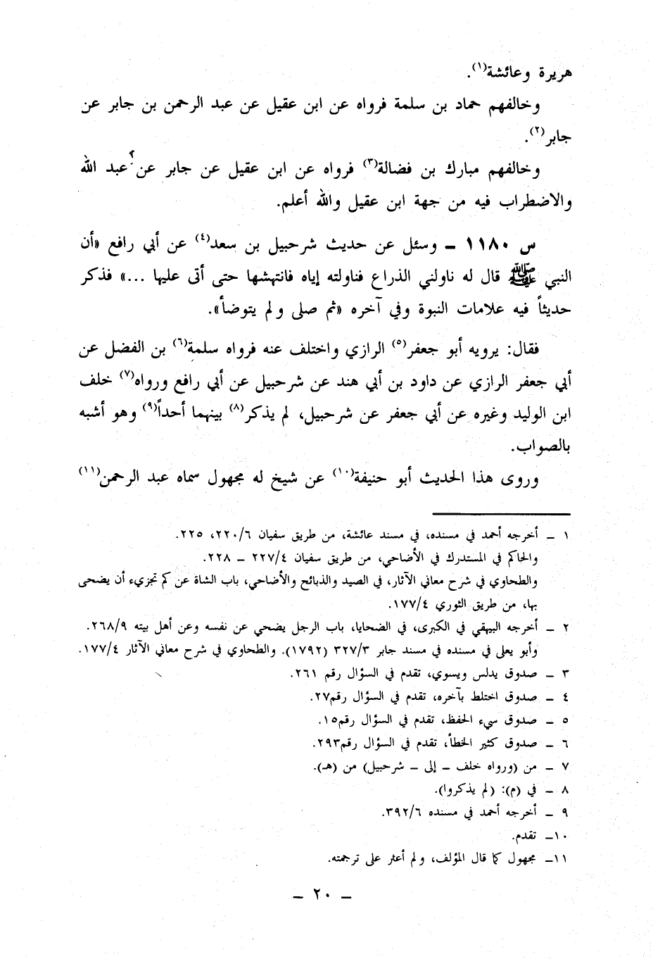 1180- وَسُئِلَ عَنْ حَدِيثِ شُرَحْبِيلَ بْنِ سَعْدٍ، عَنْ أَبِي رَافِعٍ: أَنَّ النَّبِيَّ صَلَّى اللَّهُ عَلَيْهِ وَسَلَّمَ، قَالَ لَهُ: نَاوِلْنِي الذِّرَاعَ، فَنَاوَلْتُهُ إِيَّاهُ فَانْتَهَشَهَا حَتَّى أَتَى عَلَيْهَا فَذَكَرَ حَدِيثًا فِيهِ عَلَامَاتُ النُّبُوَّةِ، وَفِي آخِرِهِ ثُمَّ صَلَّى وَلَمْ يَتَوَضَّأْ.