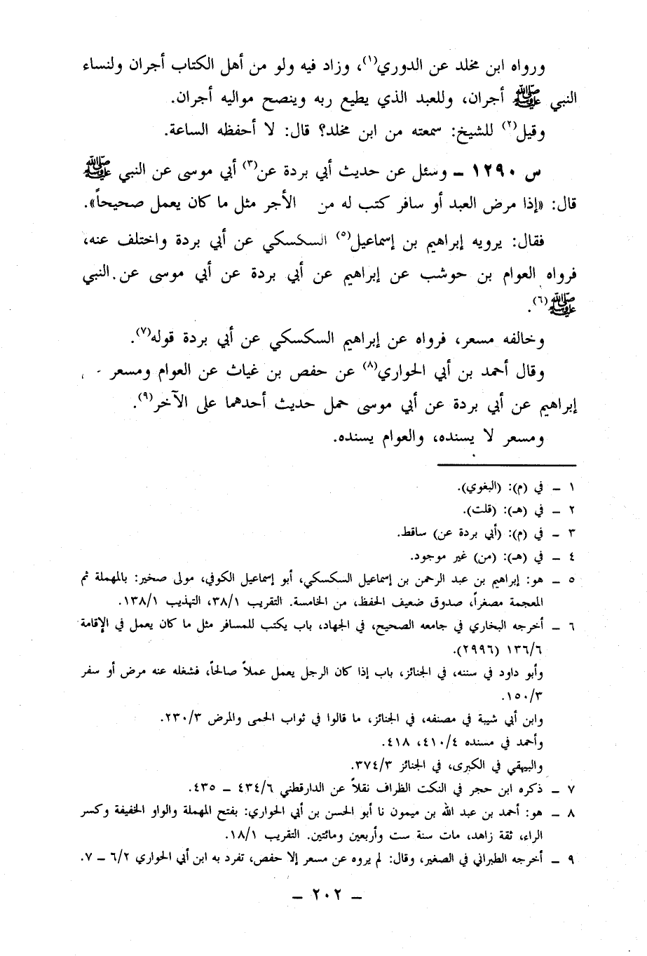1290- وَسُئِلَ عَنْ حَدِيثِ أَبِي بُرْدَةَ، عَنْ أَبِي مُوسَى، عَنِ النَّبِيِّ صَلَّى اللَّهُ عَلَيْهِ وَسَلَّمَ، قَالَ: إِذَا مَرَضَ الْعَبْدُ، أَوْ سَافَرَ كُتِبَ لَهُ مِنَ الْأَجْرِ مِثْلَ مَا كَانَ يَعْمَلُ صَحِيحًا.