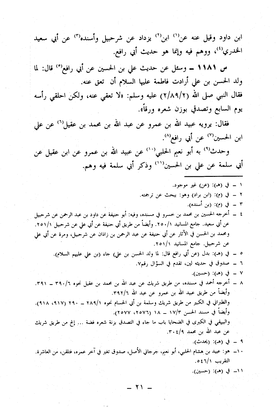 1181- وَسُئِلَ عَنْ حَدِيثِ عَلِيِّ بْنِ الْحُسَيْنِ، عَنْ أَبِي رَافِعٍ، قَالَ: لَمَّا وُلِدَ الْحَسَنُ بْنُ عَلِيٍّ أَرَادَتْ فَاطِمَةُ عَلَيْهَا السَّلامُ أَنْ تَعُقَّ عَنْهُ، فَقَالَ النَّبِيُّ صَلَّى اللَّهُ عَلَيْهِ وَسَلَّمَ: لَا تَعُقِّي عَنْهُ وَلَكِنِ احْلِقِي رَأْسَهُ يَوْمَ السَّابِعِ، وَتَصَدَّقِي بِوَزْنِ شَعْرِهِ وَرِقًا.