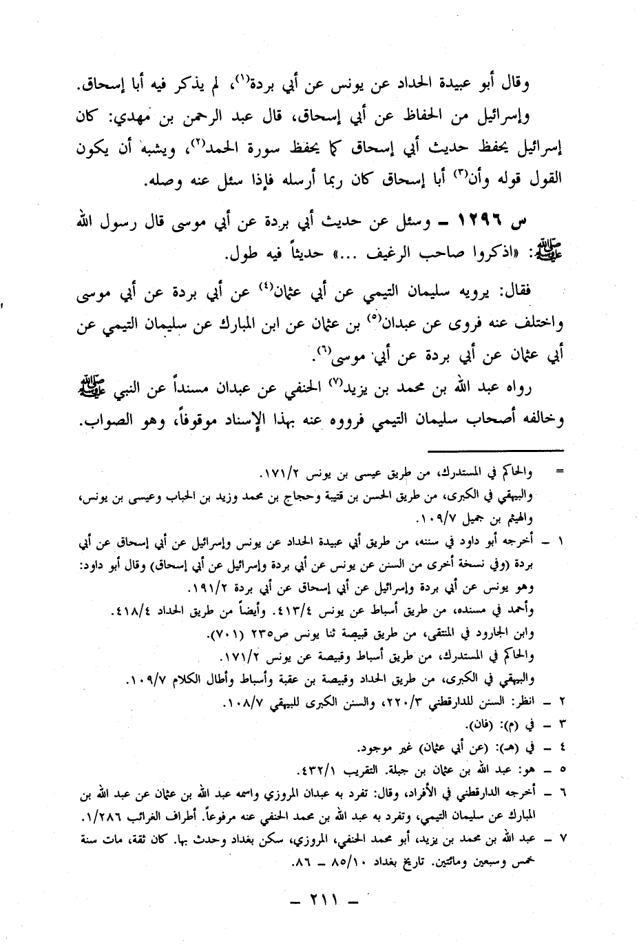 1296- وَسُئِلَ عَنْ حَدِيثِ أَبِي بُرْدَةَ، عَنْ أَبِي مُوسَى، قَالَ رَسُولُ اللَّهِ صَلَّى اللَّهُ عَلَيْهِ وَسَلَّمَ: اذْكُرُوا صَاحِبَ الرَّغِيفِ حَدِيثًا فِيهِ طُولٌ.