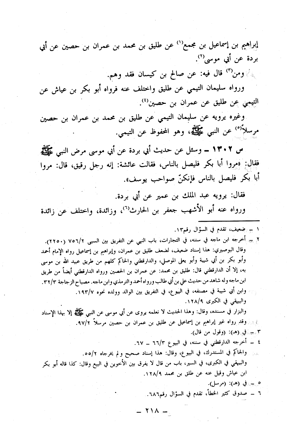 1302- وَسُئِلَ عَنْ حَدِيثِ أَبِي بُرْدَةَ، عَنْ أَبِي مُوسَى: مَرِضَ النَّبِيُّ صَلَّى اللَّهُ عَلَيْهِ وَسَلَّمَ، فَقَالَ: مُرُوا أَبَا بَكْرٍ فَلْيُصَلِّ بِالنَّاسِ، فَقَالَتْ عَائِشَةُ: إِنَّهُ رَجُلٌ رَقِيقٌ، قَالَ: مُرُوا أَبَا بَكْرٍ فَلْيُصَلِّ بِالنَّاسِ فَإِنَّكُنَّ صَوَاحِبُ يُوسُفَ.