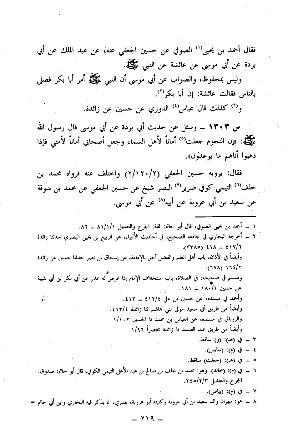 1303- وَسُئِلَ عَنْ حَدِيثِ أَبِي بُرْدَةَ، عَنْ أَبِي مُوسَى، قَالَ رَسُولُ اللَّهِ صَلَّى اللَّهُ عَلَيْهِ وَسَلَّمَ: إِنَّ النُّجُومَ جُعِلَتْ أَمَانًا لِأَهْلِ السَّمَاءِ، وَجُعِلَ أَصْحَابِي أَمَانًا لِأُمَّتِي، فَإِذَا ذَهَبُوا أَتَاهُمْ مَا يُوعَدُونَ.