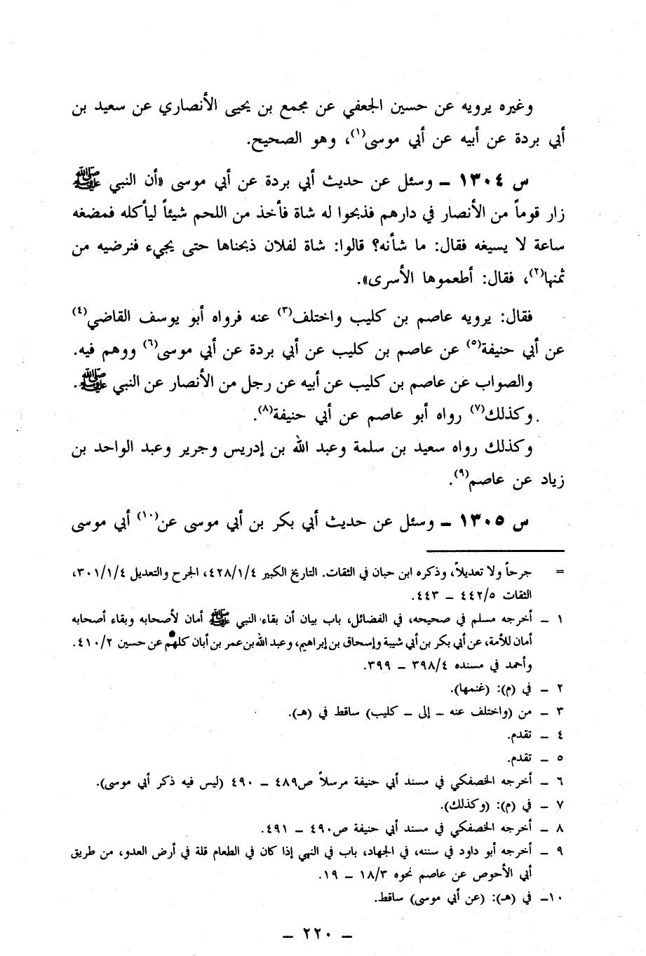 1304- وَسُئِلَ عَنْ حَدِيثِ أَبِي بُرْدَةَ، عَنْ أَبِي مُوسَى: أَنَّ النَّبِيَّ صَلَّى اللَّهُ عَلَيْهِ وَسَلَّمَ: زَارَ قَوْمًا مِنَ الْأَنْصَارِ فِي دَارِهِمْ فَذَبَحُوا لَهُ شَاةً، فَأَخَذَ مِنَ اللَّحْمِ شَيْئًا لِيَأْكُلَهُ، فَمَضَغَهُ سَاعَةً لَا يَسِيغُهُ، فَقَالَ: مَا شَأْنُهُ؟ قَالُوا: شَاةٌ لِفُلَانٍ ذَبَحْنَاهَا حَتَّى يَجِيءَ فَنُرْضِيهِ مِنْ ثَمَنِهَا، فَقَالَ: أَطْعِمُوهَا الْأَسْرَى.