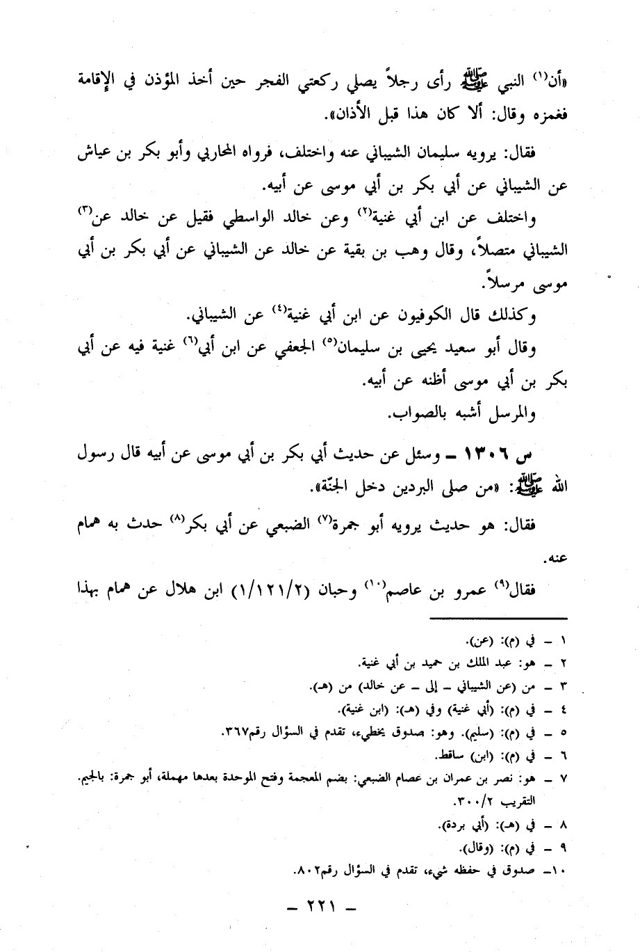 1306- وَسُئِلَ عَنْ حَدِيثِ أَبِي بَكْرِ بْنِ أَبِي مُوسَى، عَنْ أَبِيهِ، قَالَ رَسُولُ اللَّهِ صَلَّى اللَّهُ عَلَيْهِ وَسَلَّمَ: مَنْ صَلَّى الْبُرْدَيْنِ دَخَلَ الْجَنَّةَ.