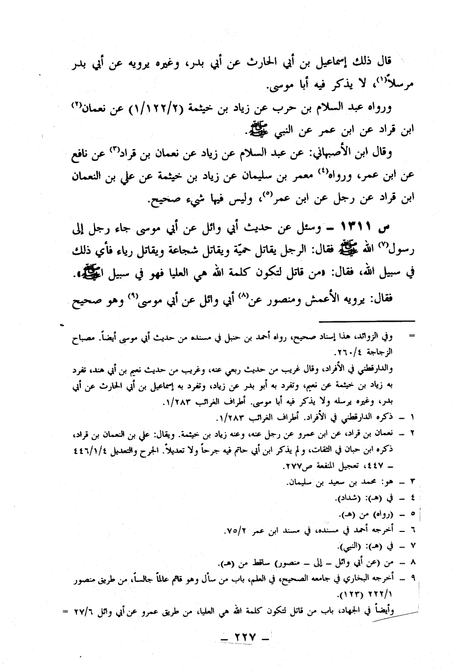 1311- وَسُئِلَ عَنْ حَدِيثِ أَبِي وَائِلٍ، عَنْ أَبِي مُوسَى جَاءَ رَجُلٌ إِلَى رَسُولِ اللَّهِ صَلَّى اللَّهُ عَلَيْهِ وَسَلَّمَ، فَقَالَ: الرَّجُلُ يُقَاتِلُ حَمِيَّةً، وَيُقَاتِلُ شَجَاعَةً، وَيُقَاتِلُ رِيَاءً، فَأَيُّ ذَلِكَ فِي سَبِيلِ اللَّهِ؟ فَقَالَ: مَنْ قَاتَلَ لِتَكُونَ كَلِمَةُ اللَّهِ هِيَ الْعُلْيَا فَهُوَ فِي سَبِيلِ اللَّهِ.