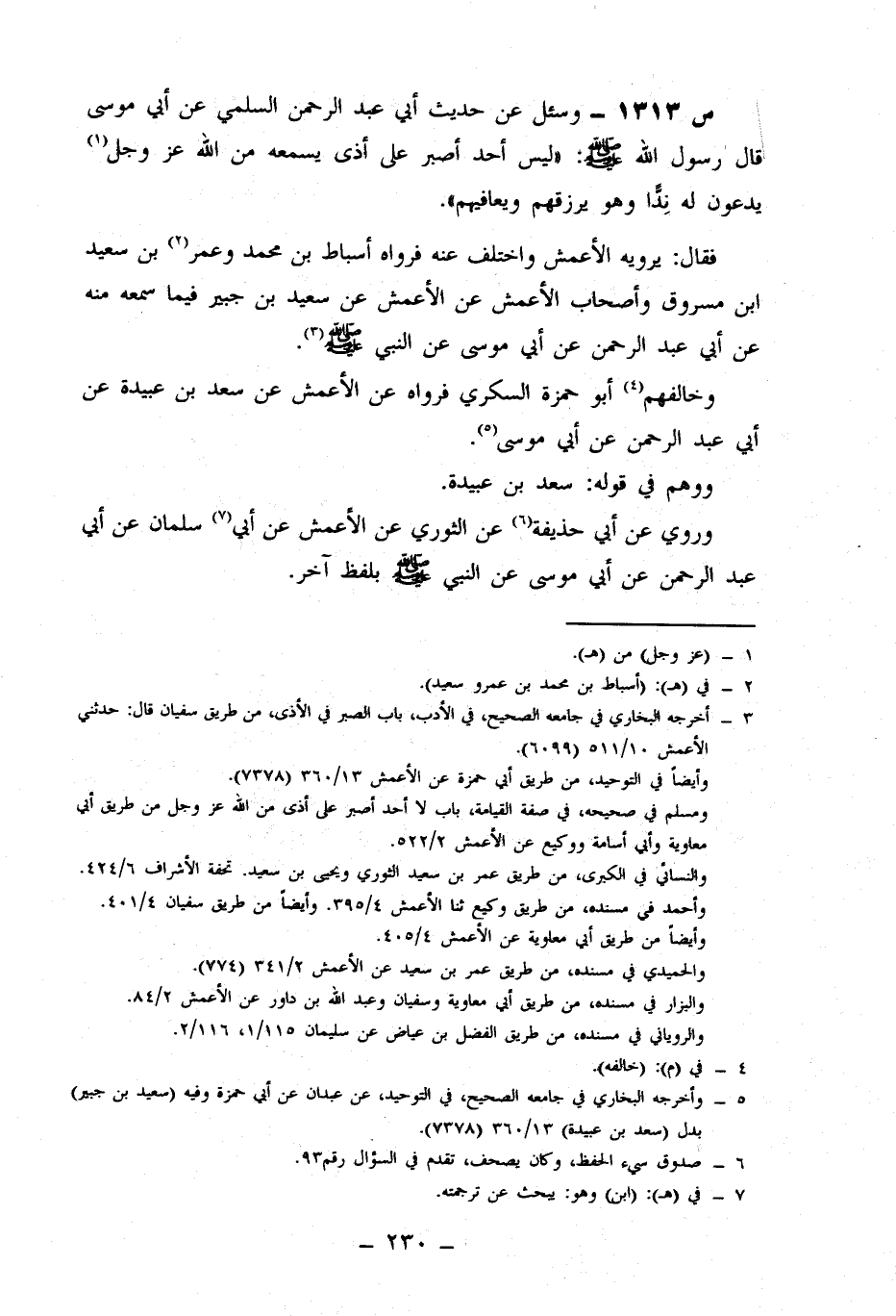 1313- وسئل عن حديث أبي عبد الرحمن السلمي، عَنْ أَبِي مُوسَى، قَالَ رَسُولُ اللَّهِ صَلَّى اللَّهُ عَلَيْهِ وَسَلَّمَ: لَيْسَ أَحَدٌ أَصْبَرَ عَلَى أَذًى يَسْمَعُهُ مِنَ اللَّهِ عَزَّ وَجَلَّ، يَدْعُونَ لَهُ نِدًّا وَهُوَ يَرْزُقُهُمْ وَيُعَافِيهِمْ.