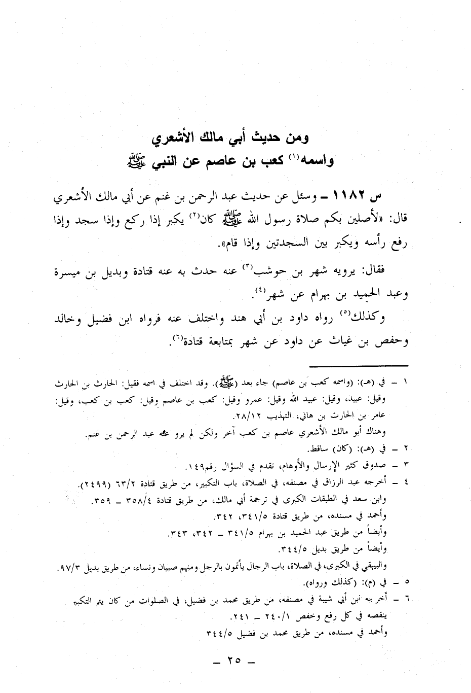1182- وَسُئِلَ عَنْ حَدِيثِ عَبْدِ الرَّحْمَنِ بْنِ غُنْمٍ، عَنْ أَبِي مَالِكٍ الْأَشْعَرِيِّ، قَالَ لَأُصَلِّيَنَّ بِكُمْ صَلَاةَ رسول الله صلى الله عليه وسلم، كان يُكَبِّرُ إِذَا رَكَعَ، وَإِذَا سَجَدَ، وَإِذَا رَفَعَ رَأْسَهُ، وَيُكَبِّرُ بَيْنَ السَّجْدَتَيْنِ، وَإِذَا قَامَ.