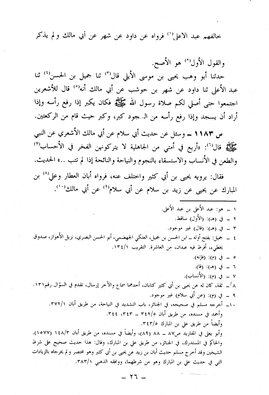 1183- وَسُئِلَ عَنْ حَدِيثِ أَبِي سَلَّامٍ، عَنْ أَبِي مَالِكٍ الْأَشْعَرِيِّ، عَنِ النَّبِيِّ صَلَّى اللَّهُ عَلَيْهِ وَسَلَّمَ، قَالَ: أَرْبَعٌ فِي أُمَّتِي مِنَ الْجَاهِلِيَّةِ لَا يَتْرُكُونَهُنَّ: الْفَخْرُ فِي الْأَحْسَابِ، وَالطَّعْنُ فِي الْأَنْسَابِ، وَالِاسْتِسْقَاءُ بِالنُّجُومِ، وَالنِّيَاحَةُ وَالنَّائِحَةُ إِذَا لَمْ تتب.... الحديث.