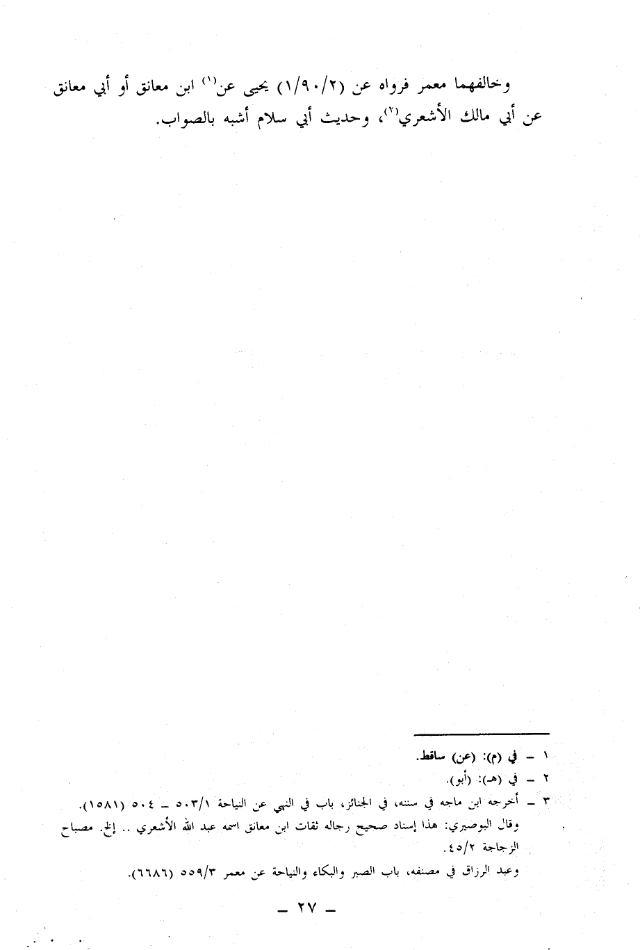 وَخَالَفَهُمَا مَعْمَرٌ، فَرَوَاهُ عَنْ يَحْيَى، عَنِ ابْنِ مُعَانِقٍ أَوْ أَبِي مُعَانِقٍ، عَنْ أَبِي مَالِكٍ الْأَشْعَرِيِّ، وَحَدِيثُ أَبِي سَلَّامٍ أَشْبَهُ بِالصَّوَابِ.