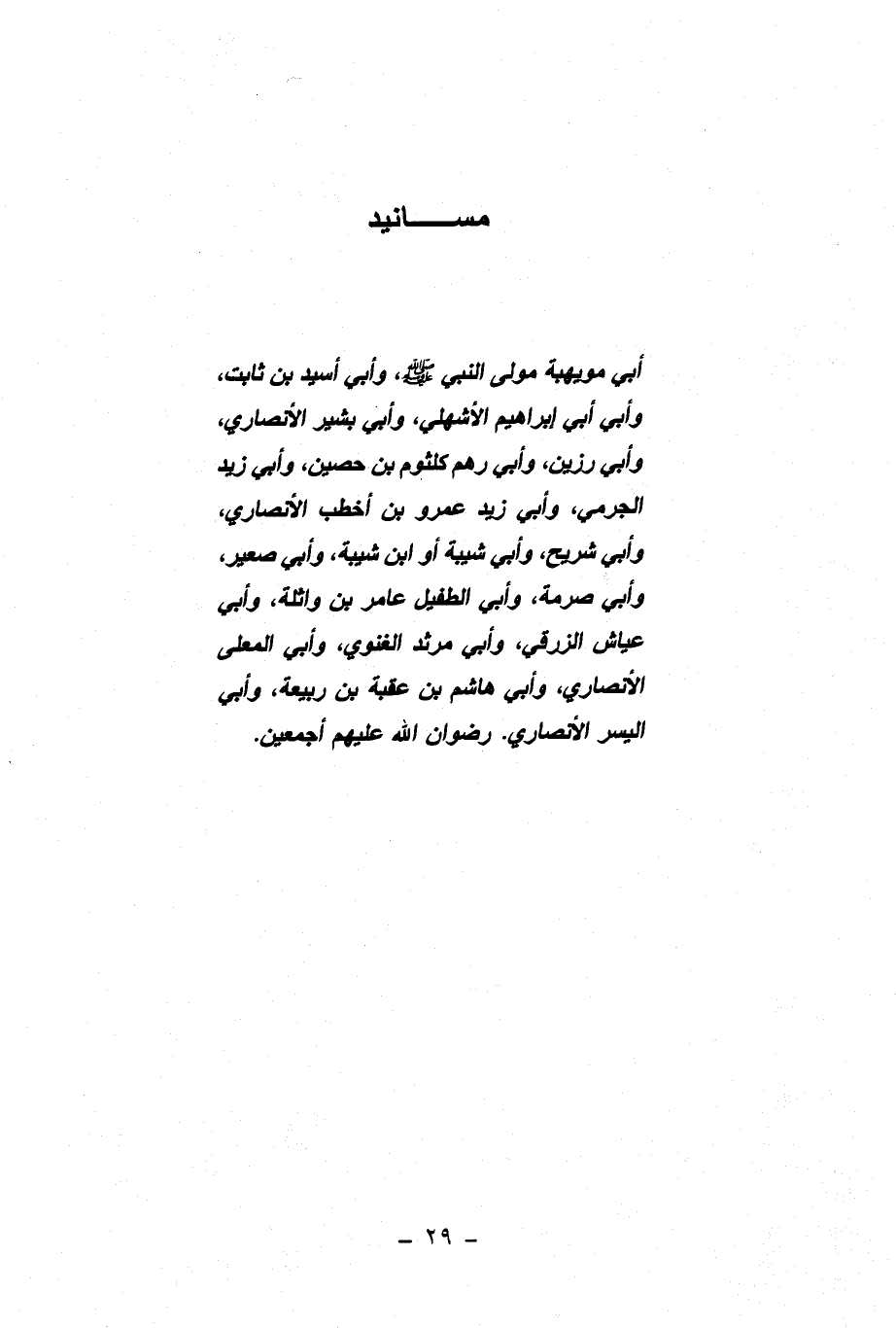 مَسَانِيدُ أَبِي مُوَيْهِبَةَ مَوْلَى النَّبِيِّ صَلَّى اللَّهُ عَلَيْهِ وَسَلَّمَ وَأَبِي أَسِيدِ بْنِ ثَابِتٍ وَأَبِي أَبِي إِبْرَاهِيمَ الْأَشْهَلِيِّ وَأَبِي بَشِيرٍ الْأَنْصَارِيِّ وَأَبِي رَزِينٍ وَأَبِي رُهْمٍ كُلْثُومِ بْنِ حُصَيْنٍ وَأَبِي زَيْدٍ الْجَرْمِيِّ وَأَبِي زَيْدٍ عَمْرِو بْنِ أَخْطَبَ الْأَنْصَارِيِّ وَأَبِي شُرَيْحٍ وَأَبِي شَيْبَةَ، أَوِ ابْنِ شَيْبَةَ وَأَبِي صُعَيْرٍ وَأَبِي صِرْمَةَ وَأَبِي الطُّفَيْلِ عَامِرِ بْنِ وَاثِلَةَ وَأَبِي عَيَّاشٍ الزَّرْقِيِّ وَأَبِي مَرْثَدٍ الْغَنَوِيِّ وَأَبِي الْمُعَلَّى الْأَنْصَارِيِّ وَأَبِي هَاشِمِ بْنِ عُقْبَةَ بْنِ رَبِيعَةَ وَأَبِي الْيَسَرِ الْأَنْصَارِيِّ رِضْوَانُ اللَّهِ عَلَيْهِمْ أَجْمَعِينَ